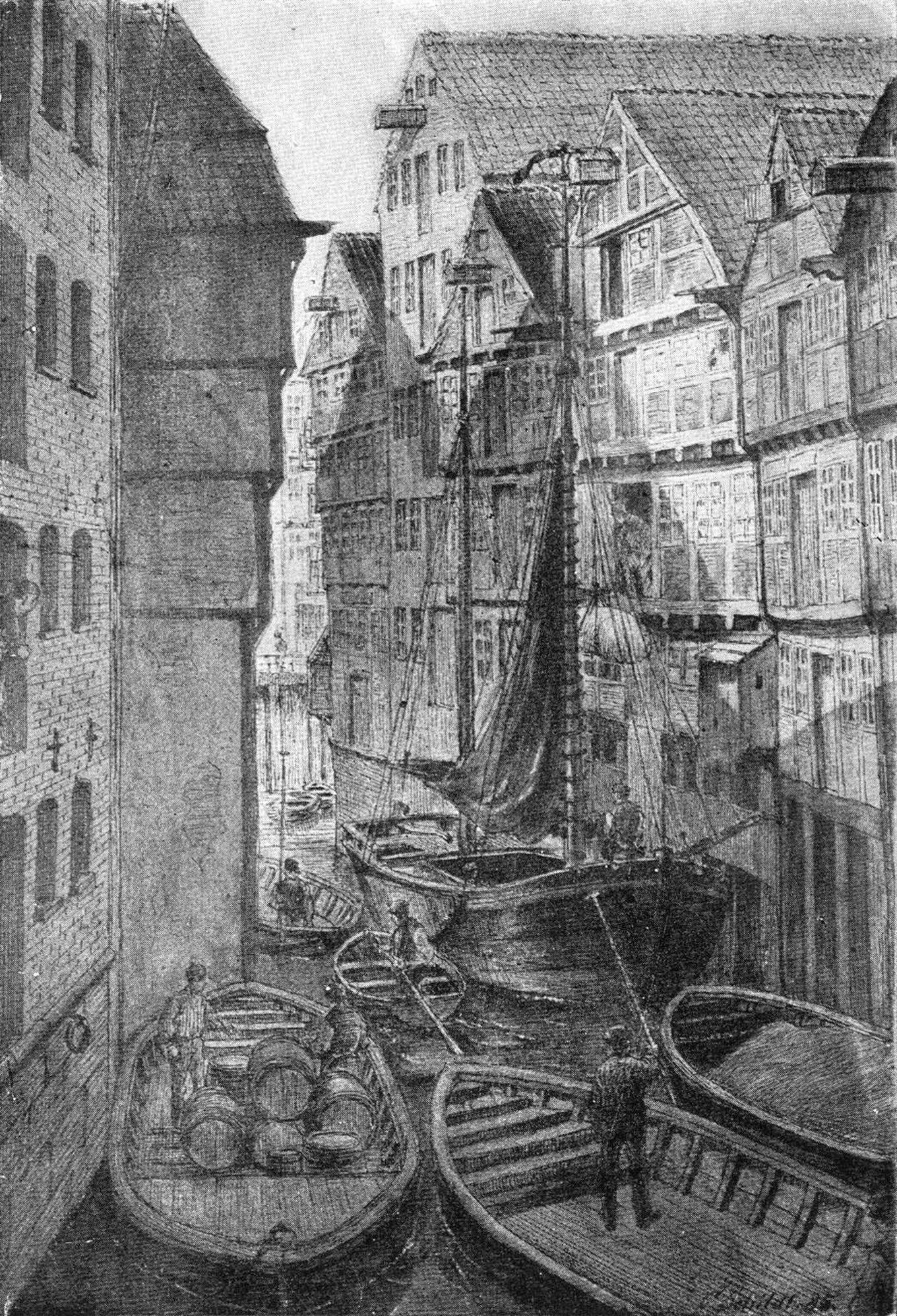 Wir dürfen die Entwicklung unseres Geschäftsviertels des Großhandels so annehmen, daß anfangs die Uferfläche, die Kaje, durchweg unbebaut liegen blieb, wie noch jetzt bei den Vorsetzen zu sehen, bis zum Zollanschluß auch z. B. beim Kehrwieder. So war es ursprünglich in der Deichstraße, im Cremon, in der Catharinenstraße, wie bei den Mühren, im Grimm usw. Hinter den Häusern, die sich also nur an einer Seite der Straße entlang zogen, erstreckten sich tiefe, schmale Gärten bis an andere Fleete, zuweilen auch bis an den Stadtwall oder an offene Abflußgräben, die später zu Fleeten erweitert und vertieft wurden (Gaedechens 41). Als die Böden des Wohnhauses dem sich ausdehnenden Geschäftsbetriebe nicht mehr genügten, begann man dann, an diesen Hinterfleeten Speicher zu errichten; später folgten schmälere Verbindungsbauten zwischen Wohnhaus und Speicher und endlich blieben statt der ehemaligen freien Stücke nur dumpfige, geschlossene Hofplätze nach. Die Lagerböden fügten sich meistens vom Vorderhause durch den Mittelbau an die Böden des Speichers in gleicher Höhe an.