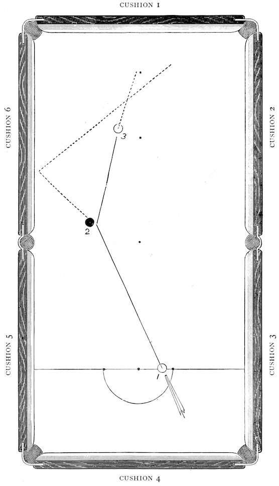 Some readers may perhaps regret the absence of a chapter on the French and American game. To them we would urge that a game so beautiful, so scientific, and capable of such development, cannot be satisfactorily treated in short space; and, therefore, it has been thought better simply to refer inquirers to M. Vignaux’s book and to ‘Modern Billiards,’ the American text-book, published by the Brunswick-Balke-Collender Co., New York. Comparison between the English and French games is scarcely profitable; they differ widely, and each has its advantages. Conspicuous amongst these in favour of the foreign game is the small size of the table which may be set up in ordinary rooms. It is cheaper and more easily lighted than that used in the English game, and, although hazards are eliminated and much interest is thereby lost, the cannon game can be brought on the smaller table to a perfection of which we scarcely even dream.