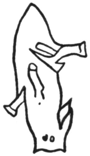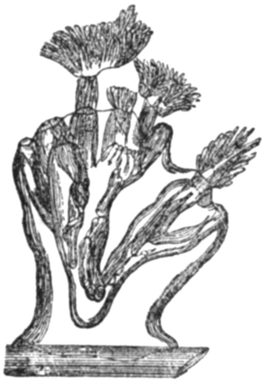 Fig. 6 stelt een ander lederkoraal (Sympodium coralloïdes) uit de Middellandsche zee voor, met een stok van ongeveer 10 centim., die van onderen geelachtig, van boven meer roodbruin is en witte of licht rozeroode poliepen draagt. Aan het worteleinde bevinden zich geen poliepen. De afzonderlijke dieren zijn bundelsgewijs vereenigd[194] tot een stok, die van onderen op een voet steunt en van boven in lobben of lapjes uitloopt.