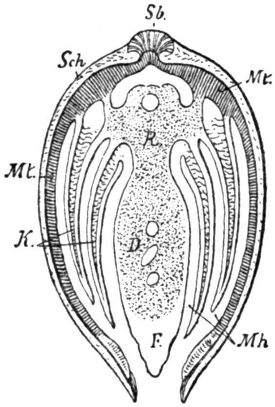 Van boven naderen die tusschenschotten veel meer tot elkaar en zijn daar verbonden met een soort van buis (Sch), waar de mond (M) in uitkomt en die als een soort van slokdarm kan beschouwd worden, waardoor het voedsel in de zoogenaamde maag komt, die hier niets anders[175] is dan de spijsverterende lichaamsholte. In die holte bevinden zich ook de eieren (E), welke aan den rand der tusschenschotten bevestigd zijn en langs den minder gebruikelijken weg van den mond het lichaam verlaten, evenals de uitwerpselen. Elk eitje groeit uit tot een afzonderlijk dier, want de zee-anemonen leven geheel op zich zelf, dus niet in kolonies. Toch geschiedt de voortplanting ook wel door deeling, waarbij deelen van het lichaam afgescheiden worden, die dan tot nieuwe dieren uitgroeien. Het aantal vangarmen bedraagt, evenals dat der tusschenschotten enz., altijd 6 of een veelvoud daarvan; bij de minste aanraking of bij rust worden zij geheel in de lichaamsholte teruggetrokken en dan biedt het dier een geheel ander beeld aan. De zoo sierlijke, teere en zwellende bloem krimpt dan plotseling ineen tot een onooglijken, vormloozen klomp, zooals kan blijken, door vergelijking van de figuren 5, 6 en 12 op de plaat, die alle hetzelfde dier voorstellen.