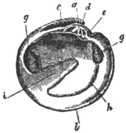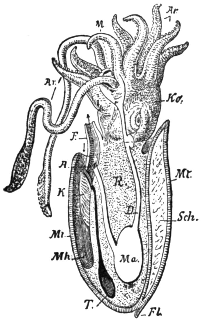 De larve, die uit het ei komt, bestaat hier uit niets anders dan een met lucht gevulde, in het water drijvende, peervormige blaas, waaraan van onderen een lange, loodrechte, draadvormige buis naar beneden afhangt Deze larve vermenigvuldigt zich door knopvorming, maar de nieuw gevormde individu’s laten niet los, doch blijven met de buis verbonden. Aan het boveneinde der gemeenschappelijke buis ontwikkelen zich die knoppen tot klokvormige wezens, die geheel op kwallen gelijken, doch zij eten niet en hebben nooit gegeten, want zij worden gratis gevoed door de voedingssappen, die haar door andere[181] leden der gemeenschap toegevoerd worden door het kanaal van de lange buis, die eigenlijk een leidingsbuis is, met voedingsbouillon voor al de dieren, die er aan bevestigd zijn. Daarom ontwikkelen zich zelfs geen voedingsorganen—noch andere organen—aan deze bovenste kwallen; elk van deze dieren is niets meer dan een eenvoudige zwemklok, die, door haar uitzetting en samentrekking, de geheele kolonie voortbeweegt, zoodat de overige leden van den staat zich daarmede het hoofd niet hebben te breken. Die zwemklokken zijn, zooals wij op de figuur zien, in twee rijen, ter weerszijden langs de voedingsas gerangschikt.