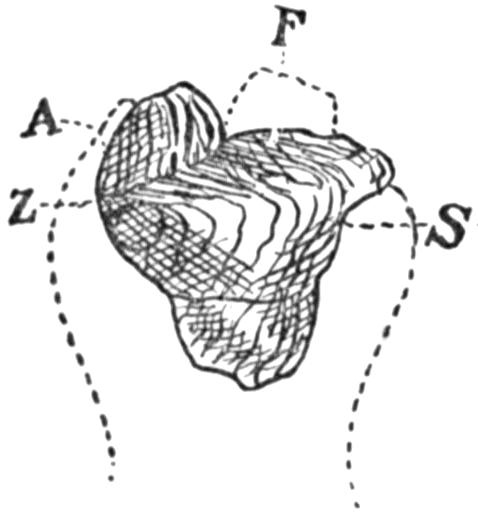 In fig. 6 zien wij een voorbeeld van de steensponsen (zie blz. 199), namelijk: de reuzen-schorsspons (Geodia gigas) uit de Middellandsche zee, bestaande uit een zeer vaste massa, zonder hoornvezels, doch uitsluitend gevormd uit regelmatige, meestal vierstralige of ankervormige kiezellichaampjes van uiterst sierlijken vorm. De oppervlakte is zwavelgeel en bedekt door een donsachtige laag van zeer fijne en breekbare naaldjes, die, bij het aanvatten, in de huid dringen en gevoelige pijn veroorzaken. In de gangen en holten van deze spons leven talrijke kreeften en ringwormen.