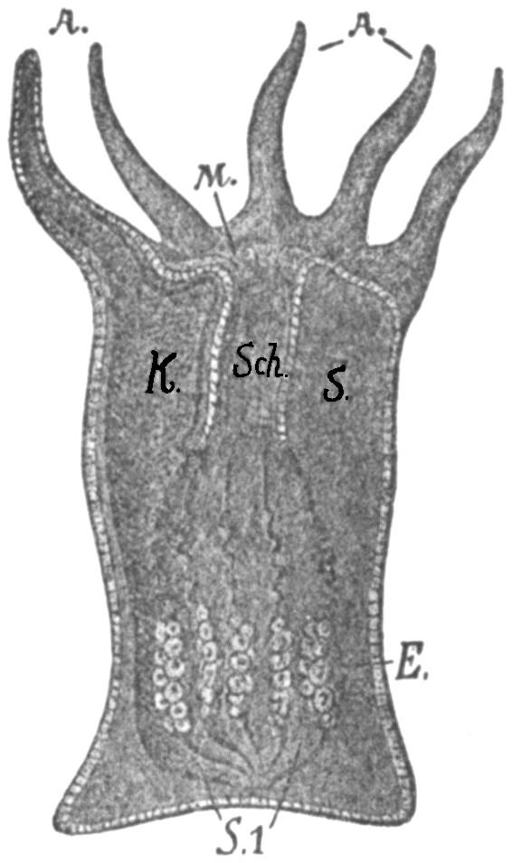 Deze dieren zijn met een breede basis aan rotsen, steenen, zeeplanten of schelpen vastgegroeid en daartegenover ligt de mond (M), die hier dus naar boven gericht en door een groot aantal holle vangarmen (A) omringd is, wier holten, zooals wij bij den doorgesneden arm ter linkerzijde zien, weer met de lichaamsholte in verband staan. Deze laatste vertoont echter een groot verschil met die van de kwalpoliepen en de schermkwallen, daar zij door overlangsche, straalsgewijs geplaatste tusschenschotten (Mesenteriën), S en S1, in een aantal kamers verdeeld is, wier holten (K) met de holle vangarmen samenhangen, zoodat deze laatsten, door inpersen van water uit die holten, uitgebreid en door uitpersen weer ingetrokken kunnen worden. Het is curieus, om in het aquarium te zien, hoe handig de dieren die talrijke vangarmen uitslaan en er de prooi of het aangeboden middagmaal mee grijpen.