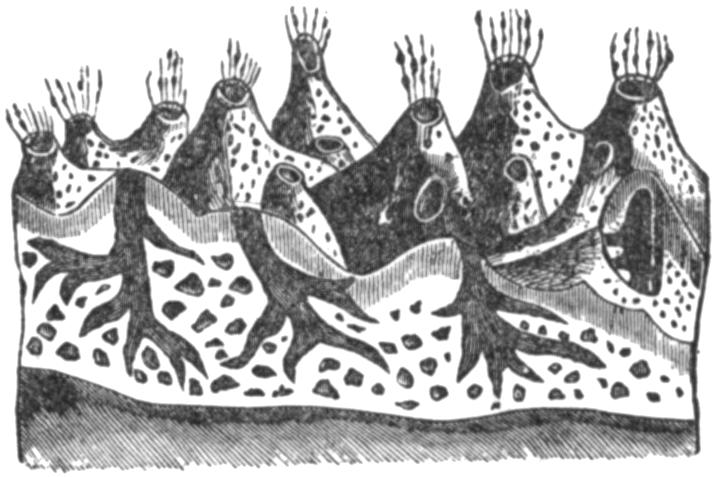 De bloempoliepen, die dezen bewonderenswaardigen arbeid verrichten, en waarvan wij reeds vroeger (bladz. 173) de algemeene organisatie beschreven en door een figuur (fig. N, bladz. 174) in schets voorstelden, behooren, wel is waar, tot dezelfde klasse der darmholtedieren[190] als de heerlijke „zee-rozen” en „zee-anemonen”, die wij in onze aquaria bewonderen (bladz. 173 en 176), doch terwijl deze laatsten afzonderlijk op zich zelf blijven leven, hebben wij bij de koraalpoliepen te doen met uitgebreide kolonies van poliepen, wier leden met elkaar verbonden blijven en, door een hard skelet van koolzure kalk gesteund, op den bodem van den oceaan bevestigd blijven.
