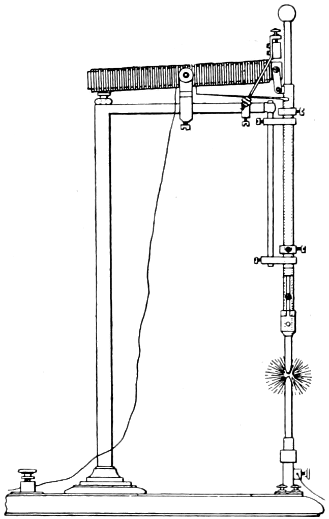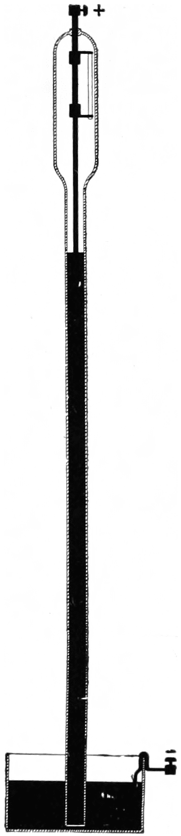 This was accomplished by a piece of carbon through which the air could seep, but if covered with mercury would make a tight seal. As the air pressure became low, an increased current would flow through the tube, the normal being about a tenth of an ampere. This accordingly increased the current flowing through the primary coil of the transformer. In series with the primary coil was an electro-magnet which lifted, as the current increased, a bundle of iron wires mounted in a glass tube which floated in mercury. The glass tube, rising, lowered the height of the mercury, uncovering a carbon rod cemented in a tube connecting the main tube with the open air. Thus air could seep through this carbon rod until the proper amount was fed into the main tube. When the current came back to normal the electro-magnet lowered the floating glass tube which raised the height of the mercury and covered the carbon rod, thus shutting off the further supply of air.