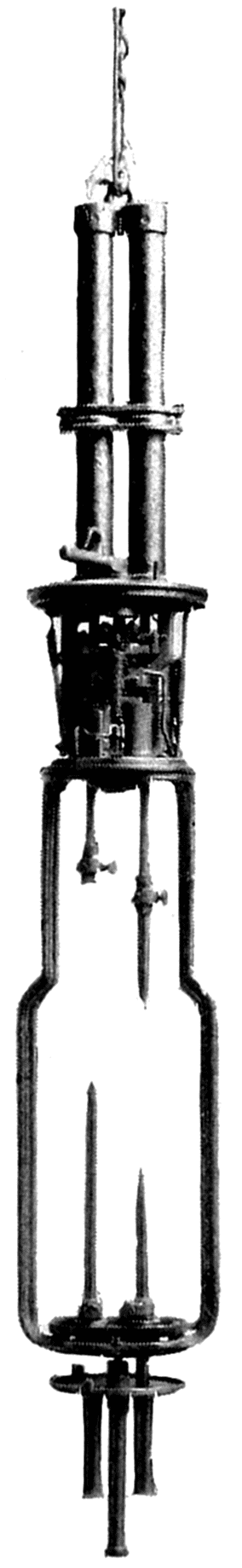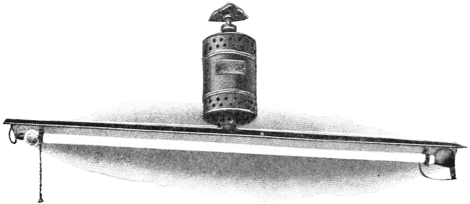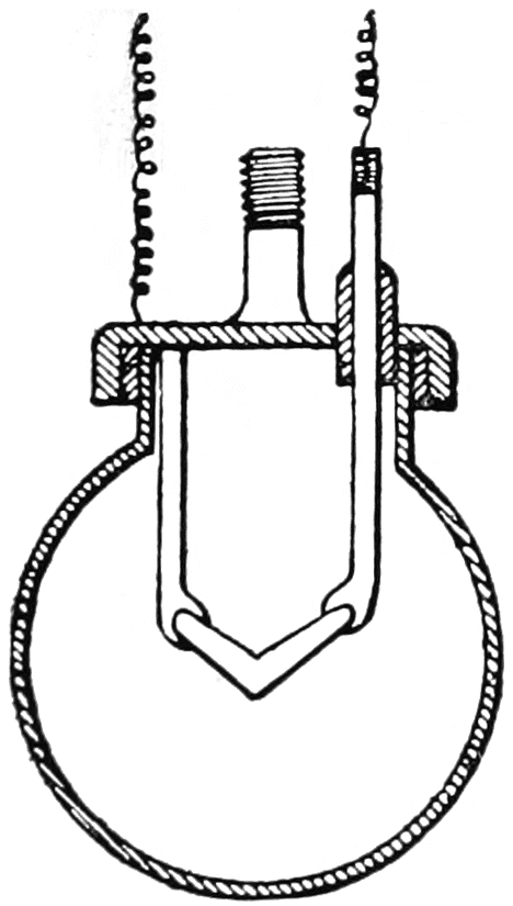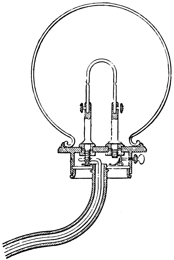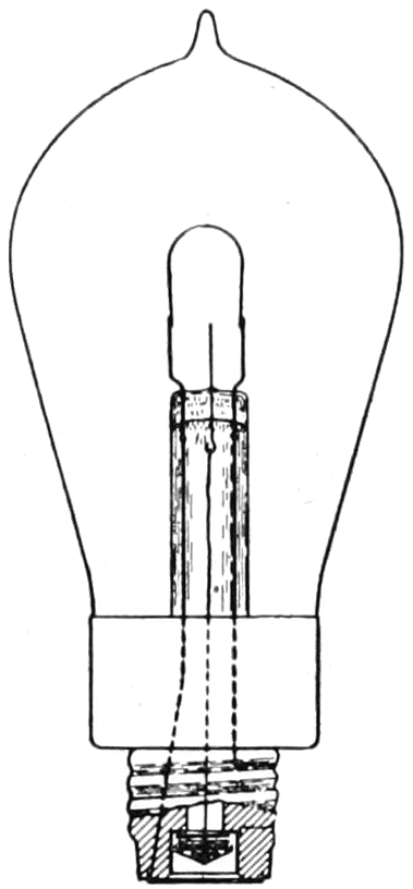 The resistance of the glower decreases with increase in current, so a steadying resistance was put in series with it. This consisted of72 an iron wire mounted in a bulb filled with hydrogen gas and was called a “ballast.” Iron has the property of increasing in resistance with increase in current flowing through it, this increase being very marked between certain temperatures at which the ballast was operated. The lamp was put on the American market in 1900 for use on 220-volt alternating current circuits. The glower consumed 0.4 ampere. One, two, three, four and six glower lamps were made, consuming 88, 196, 274, 392 and 528 watts respectively. As most of the light is thrown downward, their light output was generally given in mean lower hemispherical candlepower. The multiple glower lamps were more efficient than the single glower, owing to the heat radiated from one glower to another. Their efficiencies, depending on the size, were from about 3½ to 5 lumens per watt, and their average candlepower throughout life was about 80 per cent of initial. The lamp disappeared from the market about 1912.
