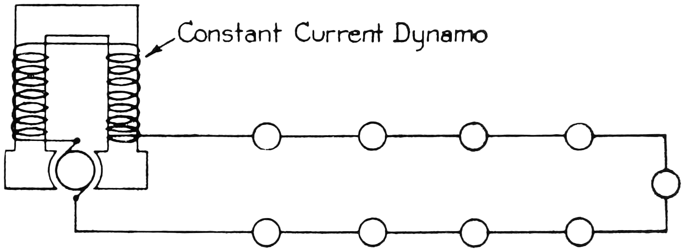 The transformers made for the two sizes of arc lamps, produced 6.6 and 7.5 amperes and incandescent lamps, in various sizes from 16 to 50 cp, were made for these currents so that the incandescent lamps could be operated on the same circuit with the arc lamps. The carbon series incandescent lamp, however, was more efficient if made for lower currents, so 3½-, 4- and 5½-ampere constant current transformers were made for incandescent lamps designed for these amperes. Later, however, with the advent of the tungsten filament, the 6.6-ampere series tungsten lamp was made the standard, as it was slightly more efficient than the lower current lamps, and was made in sizes from 32 to 400 cp. When the more efficient gas-filled tungsten lamps were developed, the sizes were further increased; the standard 6.6-ampere lamps now made are from 60 to 2500 cp.
