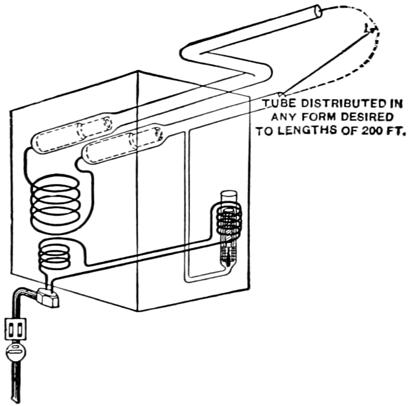 The first installation of this form of lamp was in a hardware store in Newark, N. J. It consisted of a glass tube 1¾ inches in diameter and 180 feet long. Air, at a pressure of about one-thousand part of an atmosphere, was in the tube, from which was obtained a pale pink color. High voltage (about 16,000 volts) alternating current was supplied by a transformer to two carbon electrodes inside the ends of the tube. The air had to be maintained within one ten-thousandth part of atmospheric pressure above and below the normal of one-thousandth, and as the rarefied air in the tube combined chemically with the carbon electrodes, means had to be devised to maintain the81 air in the tube at this slight pressure as well as within the narrow limits required.