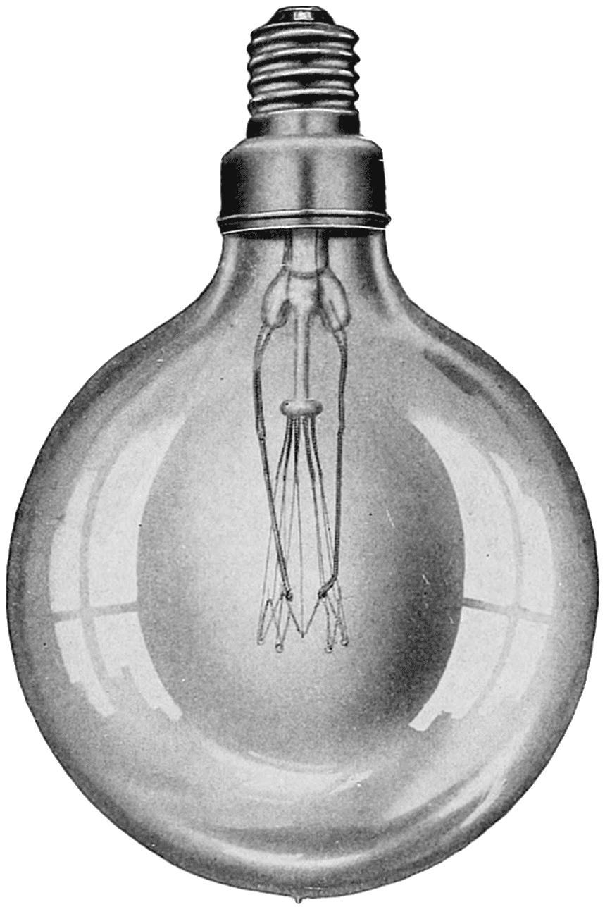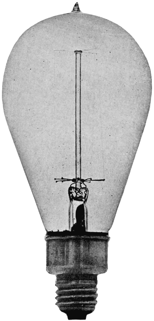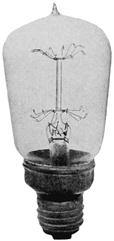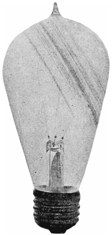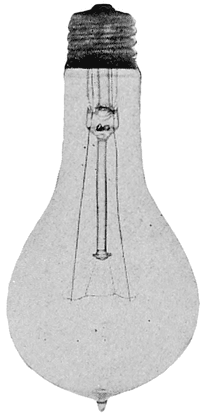 Dr. Willis R. Whitney, of Schenectady, N. Y., had invented an electrical resistance furnace. This consisted of a hollow carbon tube, packed in sand, through which a very heavy current could be passed. This heated the tube to a very high temperature, the sand preventing the tube from oxidizing, so that whatever was put inside the tube could be heated to a very high heat. Among his various83 experiments, he heated some carbon filaments and found that the high temperature changed their resistance “characteristic” from negative to positive. The ordinary carbon filament has a resistance when hot that is less than when it is cold, which was reversed after heating it to the high temperature Dr. Whitney was able to obtain. These filaments were made into lamps for 110-volt service and it was found that they could be operated at an efficiency of 4 lumens per watt. The lamps also blackened less than the regular carbon lamp throughout their life.