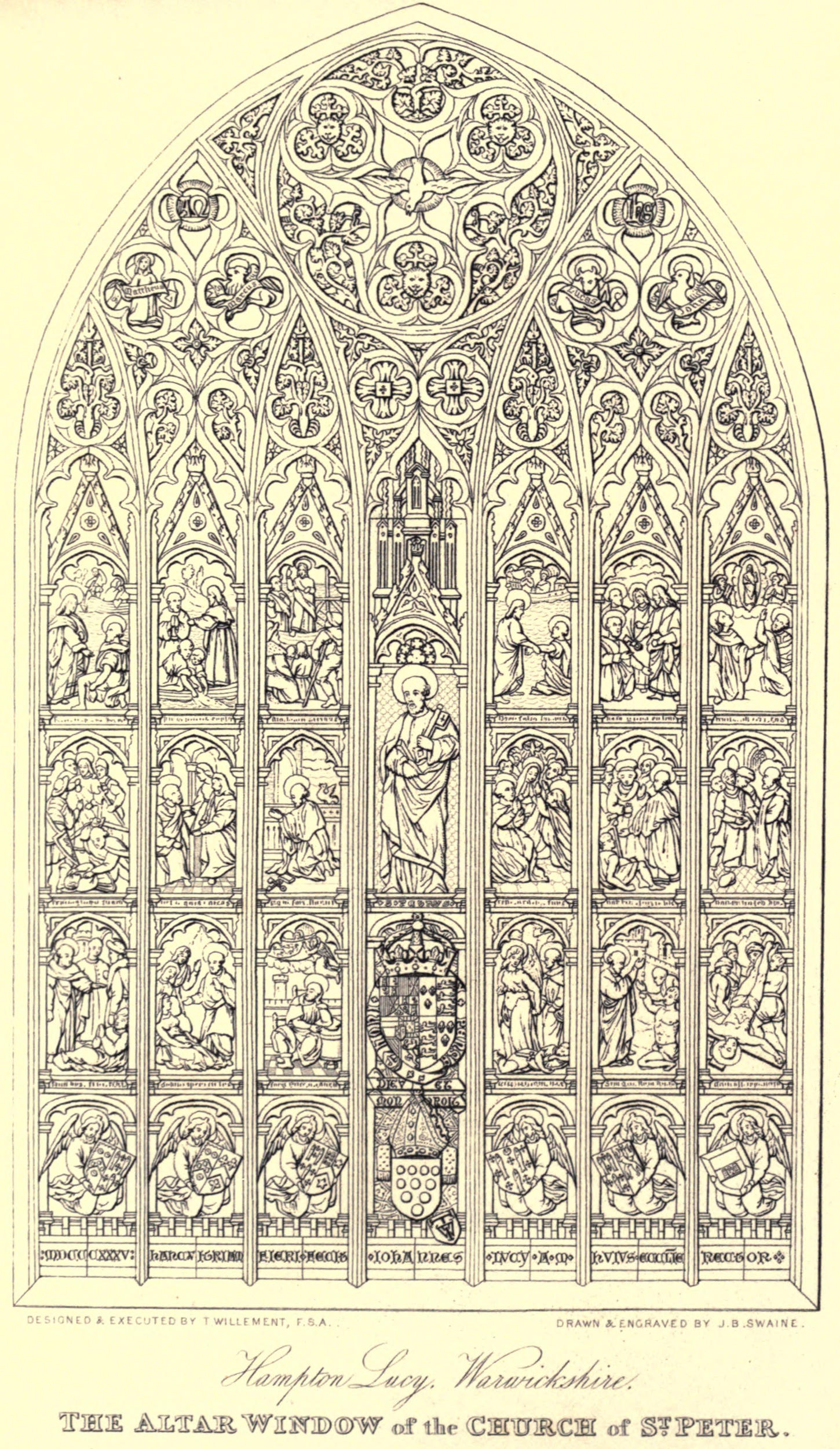 A large engraving of this window has been executed by the late John Barak Swaine, and a smaller one, which accompanies a printed account of the window, distributed at the church, at the expense of the Rev. John Lucy, who has very kindly contributed the latter one as a decoration to this catalogue.