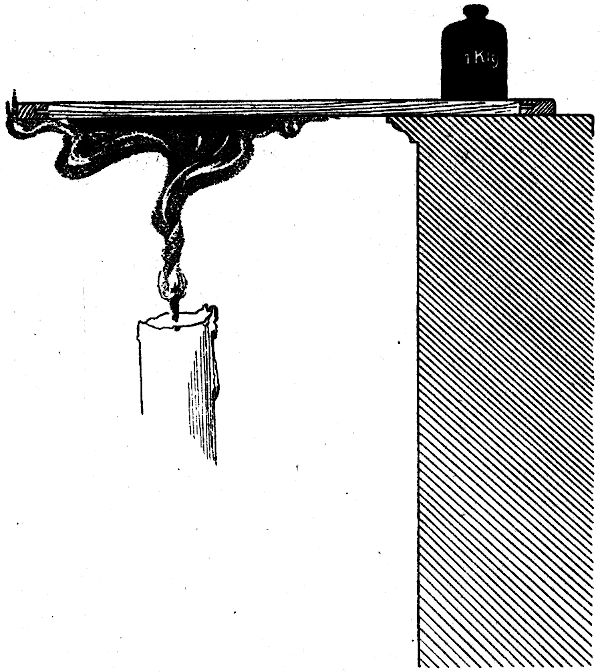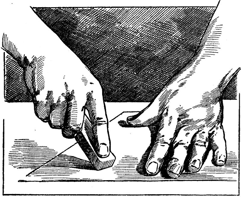 Die erste Bearbeitung der Platte muß energisch eingeleitet werden, soll die ganze Prozedur nicht allzuviel Zeit in Anspruch nehmen. Bei kleineren Platten ist es am besten, wenn man die ganze Arbeit mit einer breiten Schlichtfeile von mittelfeinem Hieb abfeilt; das geht sehr rasch und schadet der Platte bei geschickter Hantierung nicht. Die Länge der Feile muß die Platte beträchtlich überragen, damit man sie bequem handhaben kann. Bei richtiger Führung der Feile ist eine vom Feilenhieb herrührende Riefung der Oberfläche des Kupfers nicht zu befürchten. Ätzungen auf größeren Platten würden zum Ausfeilen sehr langer Feilen bedürfen; hier arbeitet man besser mit dem Schabeisen. Man beschafft es sich, indem man wieder eine Dreikantfeile (siehe Seite 67) kauft und sie in der schon beschriebenen Weise vom Messerschmied schleifen läßt, jedoch nicht wie beim Polierstahl mit abgerundeten, sondern mit scharfen Kanten. Hohlschliff ist nicht notwendig, ebensowenig ein Polieren des Werkzeuges. Mit den Kanten dieses Instrumentes wird die Ätzung ausgeschabt, jedoch darf nicht vergessen werden, große glatte Stellen (z. B. die Luft und dergl.) auch zu bearbeiten, da sonst die Platte ungleich dick aus der Arbeit hervorgehen würde. Ist die letzte Spur der Striche von der Platte[75] verschwunden, so wird die Arbeit des Schleifens mit Blaustein[6] begonnen. Es ist dies ein in jeder Werkzeughandlung erhältlicher Stein von prismatischer Form, die eine Fläche, mit der man arbeitet, muß absolut eben sein. Neue Steine erfüllen diese Forderung meist nicht, sie müssen erst auf einer anderen, harten Fläche ausgearbeitet werden. Beabsichtigt man im Anfang eine energischere Wirkung, so kann der Blaustein erst mit feinem Bimssteinpulver angewendet werden. Schleift man die Kupferplatte jedoch mit Bimsstein vor, so ist die separate Anschaffung von Bimssteinpulver überflüssig. Das Schleifen mit Bimsstein und Blaustein geschieht auf einem starken Brett mit reichlichem Zuguß von Wasser parallel den Kanten der Platte. Schließlich kommt der Blaustein allein zur Anwendung und die Glätte kann bis zu einem recht hohen Grade getrieben werden; dabei muß die Platte fleißig gespült werden, damit man das gänzliche Verschwinden sämtlicher Ritzen und Kratzer sicher beobachten kann. Der Blaustein wird seiner Längsachse parallel über die Platte geführt und zwar mit einer seiner beiden Breitseiten. Schließlich wird die Platte endgültig gespült und abgetrocknet.
