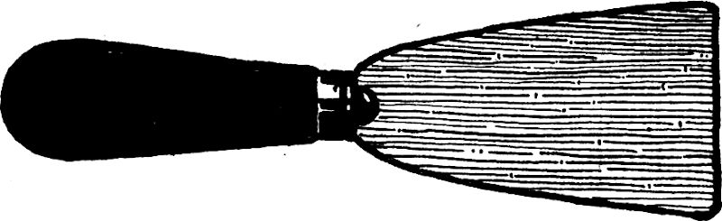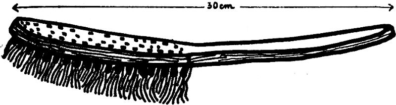 Die grundierte, kalte Platte wird auf den Tisch gelegt und mit einer gestielten feinen Stahldrahtbürste (siehe Abb. 16) sachte geschlagen, wobei die Kupferplatte mit der linken Hand fortwährend zu drehen ist, damit die Wirkung gleichmäßig erfolge. Die Verletzungen des Ätzgrundes haben nämlich die Form zarter kurzer Strichelchen von bestimmter Richtung. Das Drehen der Platte mit der linken Hand soll also das Vorherrschen einer gewissen Richtung der Strichelchen verhüten.