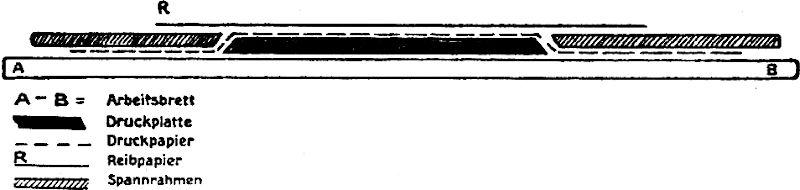 Allerdings sehr empfehlenswert ist die Anschaffung einer nicht gar zu kleinen Handwalzenpresse; namentlich dann, wenn man beabsichtigt, selbst auch eine kleine Auflage von Abzügen für den engeren Verkehr zu drucken. Man ist durchaus nicht an große Firmen gebunden, ein vertrauenswürdiger, intelligenter Maschinenschlosser wird eine solche Walzenpresse mit Bessemerwalzen samt Gestell und den zwei Tischblättern mit gewiß geringeren Kosten und ganz exakter Leistung herzustellen wissen; nur darf die Federung und die Verstellbarkeit der oberen Achsenlager nicht vergessen werden.
