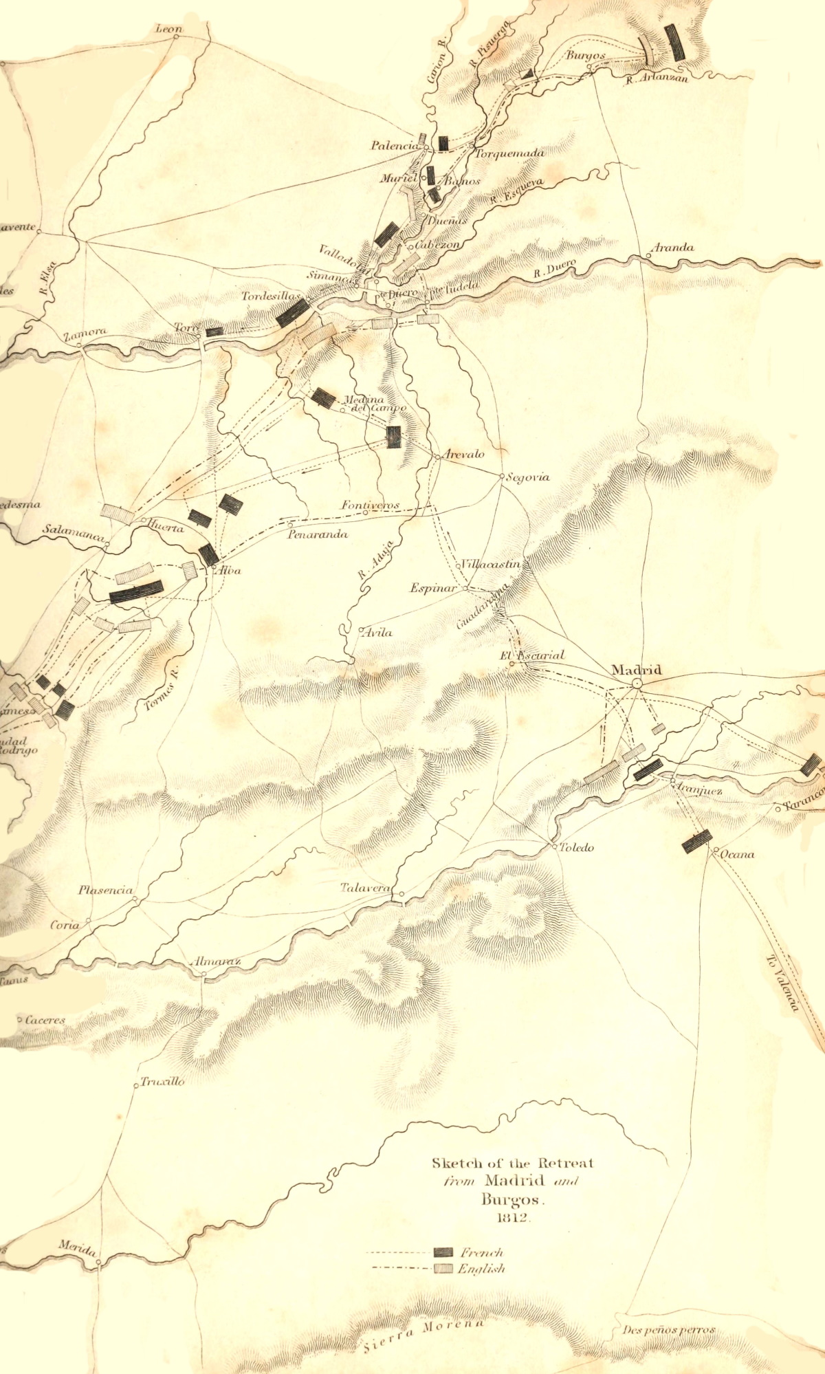 | The king and Soult advance from Valencia to the Tagus—General Hill takes a position of battle—The French pass the Tagus—Skirmish at the Puente Largo—Hill blows up the Retiro and abandons Madrid—Riot in that city—Attachment of the Madrilenos towards the British troops—The hostile armies pass the Guadarama—Souham restores the bridge of Toro—Wellington retreats towards Salamanca and orders Hill to retreat upon Alba de Tormes—The allies take a position of battle behind the Tormes—The Spaniards at Salamanca display a hatred of the British—Instances of their ferocity—Soult cannonades the castle of Alba—The king reorganizes the French armies—Soult and Jourdan propose different plans—Soult’s plan adopted—French pass the Tormes—Wellington by a remarkable movement gains the Valmusa river and retreats—Misconduct of the troops—Sir Edward Paget taken prisoner—Combat on the Huebra—Anecdote—Retreat from thence to Ciudad Rodrigo—The armies on both sides take winter cantonments | 308 |