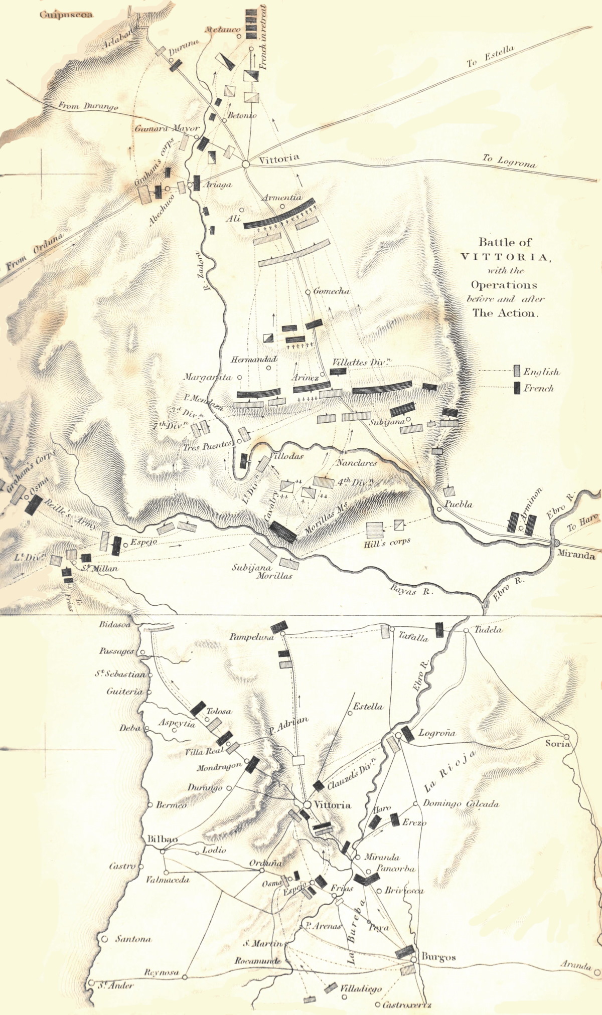 | Confused state of the French in the basin of Vittoria—Two convoys are sent to the rear—The king takes up a new order of battle—The Gallicians march to seize Orduña but are recalled—Graham marches across the hills to Murguia—Relative strength and position of the hostile armies—Battle of Vittoria—Joseph retreats by Salvatierra—Wellington pursues him up the Borundia and Araquil valleys—Sends Longa and Giron into Guipuscoa—Joseph halts at Yrursun—Detaches the army of Portugal to the Bidassoa—Retreats with the army of the centre and the army of the south to Pampeluna—Wellington detaches Graham through the mountains by the pass of St. Adrian into Guipuscoa and marches himself to Pampeluna—Combat with the French rear-guard—Joseph retreats up the valley of Roncevalles—General Foy rallies the French troops in Guipuscoa and fights the Spaniards at Montdragon—Retreats to Bergara and Villa Franca—Graham enters Guipuscoa—Combat on the Orio river—Foy retires to Tolosa—Combat there—The French posts on the sea-coast abandoned with exception of Santona and St. Sebastian—Foy retires behind the Bidassoa—Clauzel advances towards Vittoria—Retires to Logroño—Wellington endeavours to surround him—He makes a forced march to Tudela—Is in great danger—Escapes to Zaragoza—Halts there—Is deceived by Mina and finally marches to Jacca—Gazan re-enters Spain and occupies the valley of Bastan—O’Donel reduces the forts of Pancorbo—Hill drives Gazan from the valley of Bastan—Observations | 548 |