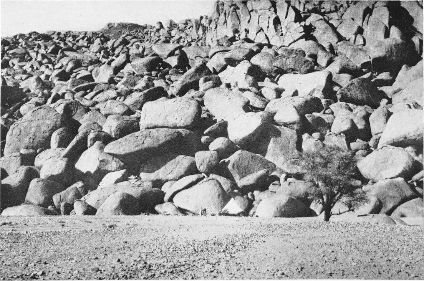(6) Great interest attaches to the discovery of typical granite in the oases of Ouenat and Arkenu. The main rock is of pegmatitic type, being composed of well-shaped felspars, glassy quartz, and hornblende. A point brought out by the photograph is the intense action of temperature variation on these igneous rocks. The whole of the hillside is strewn with gigantic boulders, some of which have been split into large pieces which obviously once formed part of the same block.