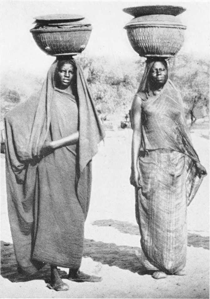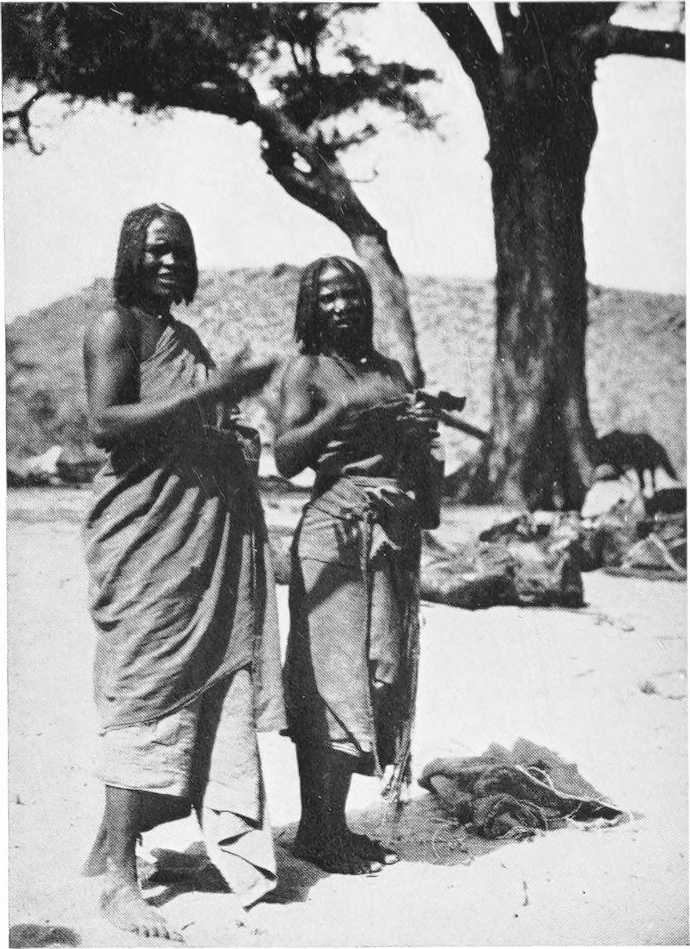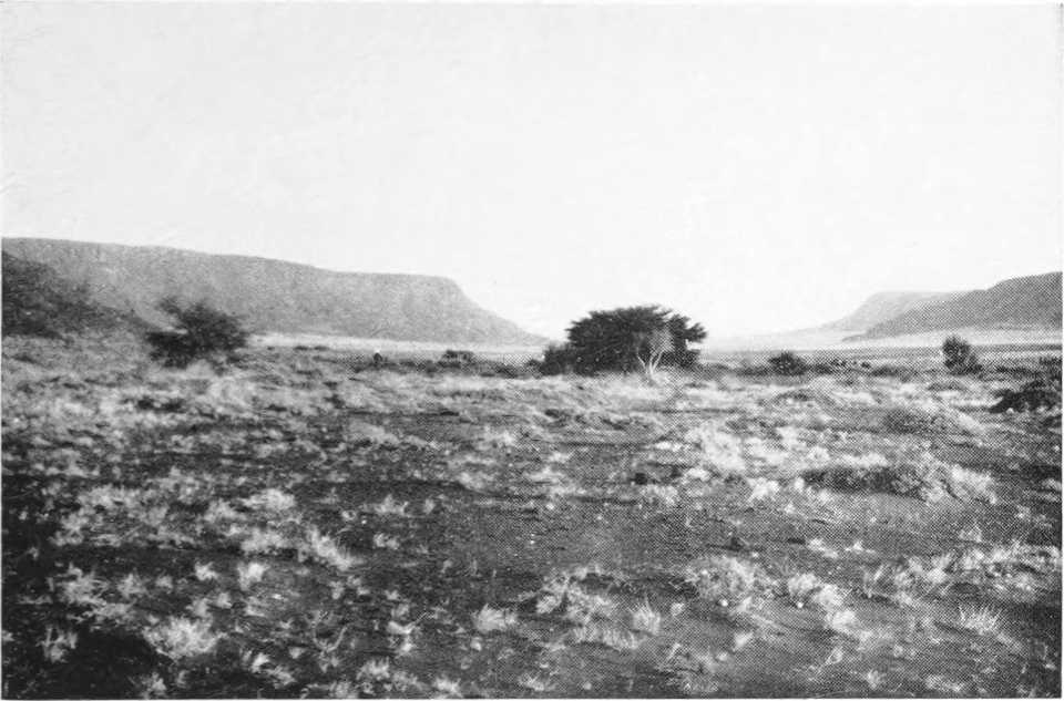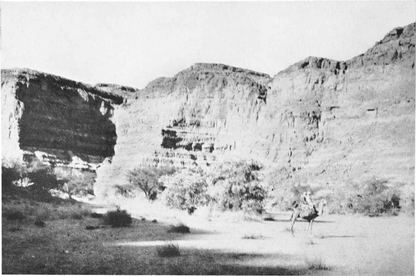 On leaving Ouenat for Erdi the igneous area is soon left behind. The actual junction between it and the Nubian Sandstone (which again forms the surface rock) occurs at a point about 20 km. south of Ouenat, and the aspect of the country again changes from the more uneven weathering of the igneous range of grays and browns to brilliant colorings of the Nubian Sandstone which forms a long series of prominent escarpments rising to heights bordering on 1000 meters above the sea between Enebah and Kuttum, after[360] which the ground begins to fall, until El Fasher is reached, where the ground-level is only about 700 or 800 meters in height.
