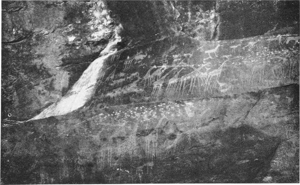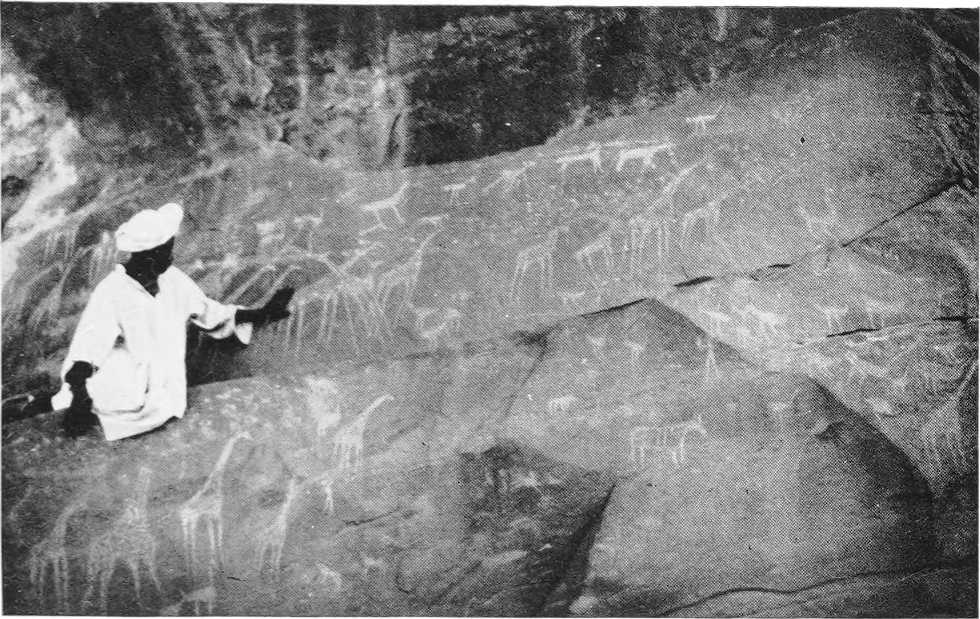 A very interesting feature is the presence of well-made drawings of giraffes and ostriches on the granite boulders. As Hassanein Bey points out, the camel is absent, and it is to be regretted that there are no pictures of human beings. These graffiti may be of ancient date, being drawn at a period when rainfall was greater in this portion of North Africa than it is at present.