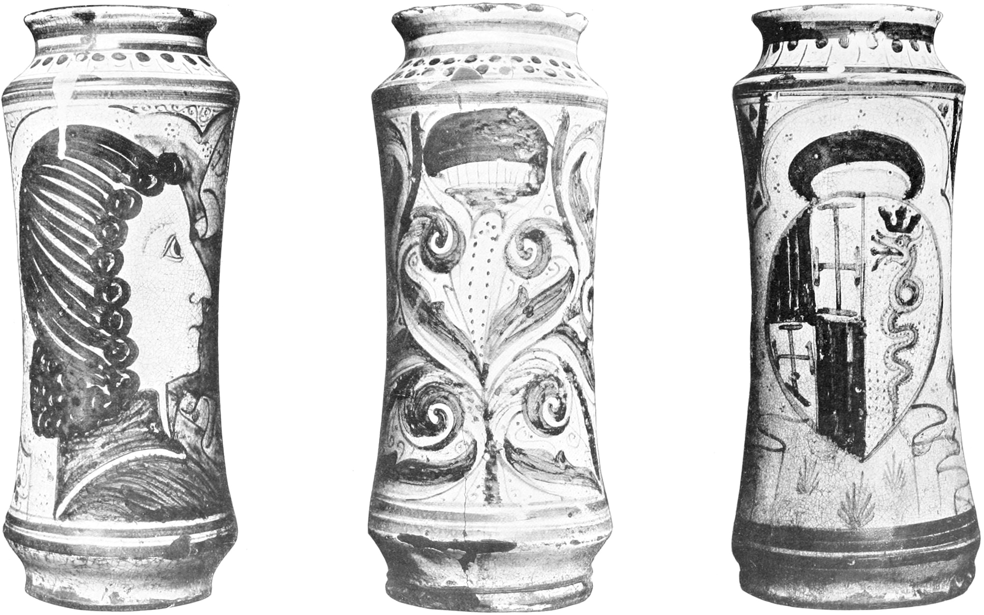 [110] They are found again, slightly more elaborated, upon an albarello of the same series in the British museum. Another one belongs to an amateur in Berlin.