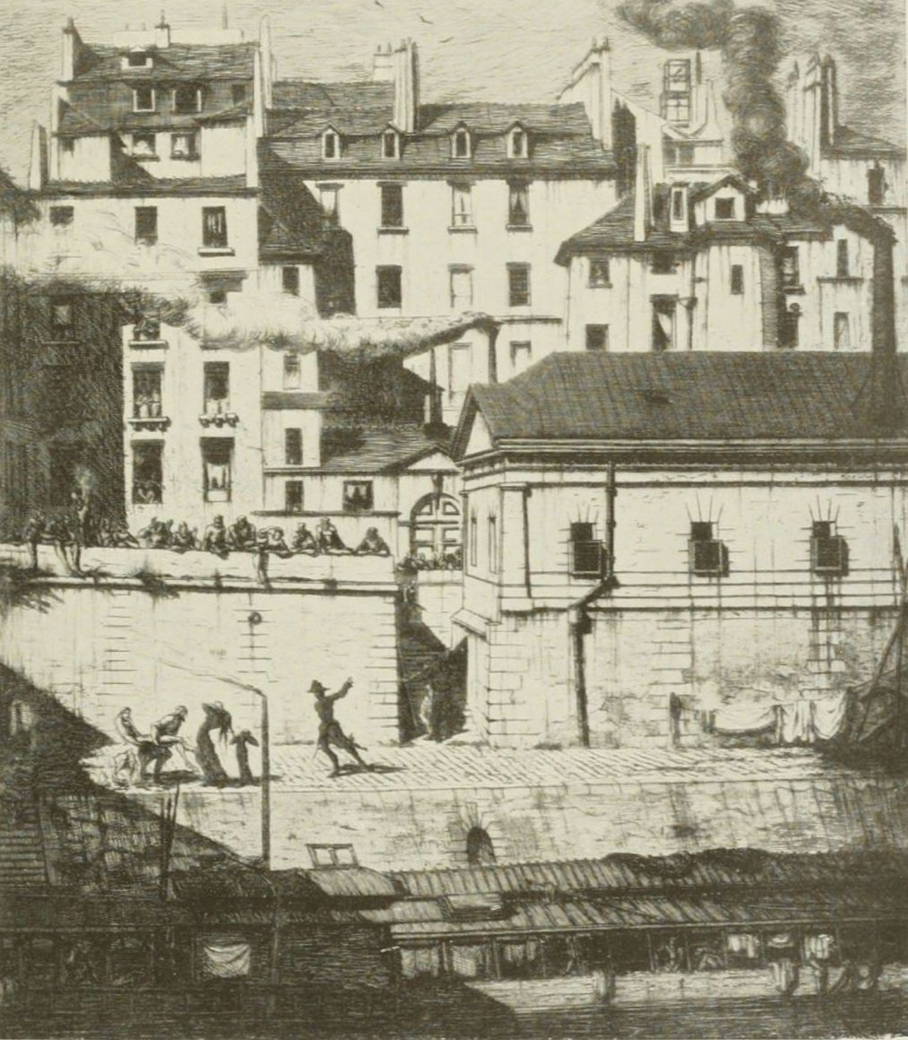 With Turner’s death, or with the death of the artists who translated him, fine Line Engraving almost vanished. It had all but disappeared when, nearly fifty years ago, there began in France and England that Revival of Etching with which the amateur of to-day is so rightly concerned. A few etchings by Bracquemond—of still-life chiefly—a larger number by Jules Jacquemart, of fine objects in porcelain, jewellery, bronze, and noble stones, are amongst the more precious products of the earlier part of the Revival of Etching, and they are so treated that they are inventions indeed, and of an originality that is exquisite. But the greatest event of the earlier years of the Revival was the appearance, as long ago as 1850, of the genius of Méryon, who, during but a few years, wrought a series of chefs-d’œuvre—inspired visions of Paris—and died, neglected and ignored, in the great city to which it is he who has raised, in those few prints of his, the noblest of all monuments.