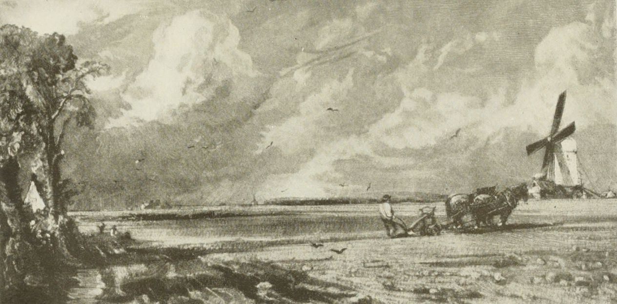 Liber Studiorum occupies an interesting and a peculiar position between work upon the copper wholly original and work wholly reproductive. Turner etched the leading lines himself. In several cases he completed, with his own hand, in mezzotint, the whole of the engraved picture; but generally he gave the “scraping” to a professional engraver, whose efforts he minutely supervised and most elaborately corrected. In recent years, almost as much, though not quite as much sought for as the Liber plates of Turner, are certain rather smaller mezzotints which record the art of Constable; but Constable himself did nothing on these plates, though he supervised their production by David Lucas. Turner’s connection with professional[Pg 21] engravers was not confined to the priceless and admirable prints of the Liber. He trained a school of line engravers, welcoming at first the assistance of John Pye and of George and William Cooke. These two brothers were the engravers mainly of his Southern Coast, and nothing has been more manly than that; but the work of William Miller, in the Clovelly of that Southern Coast, and in a subsequent series, interpreted with quite peculiar exquisiteness those refinements of light which in Turner’s middle and later time so much engaged his effort.