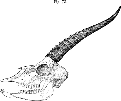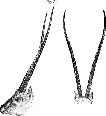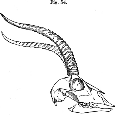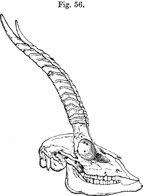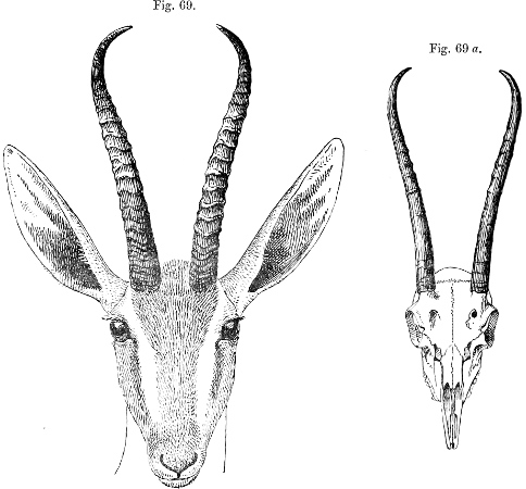 In his description Brooke pointed out that, as is well shown in the accompanying figure (p. 231), which has been copied from the plate that illustrates his paper, the skull of this Gazelle, besides its general depression, stands widely apart from those of all other species of the group in the enormous backward prolongation of the occiput—“an extension gained principally by the great size of the occipital bone and the prominence of the occipital crest.”[231] This divergence was so remarkable that Brooke doubted “whether the species should not constitute the type of a new subgenus.” As we shall see later, Brooke’s views have been fully justified by what has taken place since a close acquaintance with the structure of this singular Antelope has been acquired.