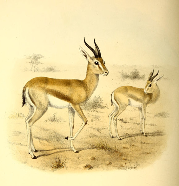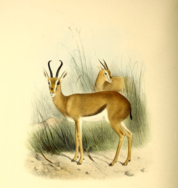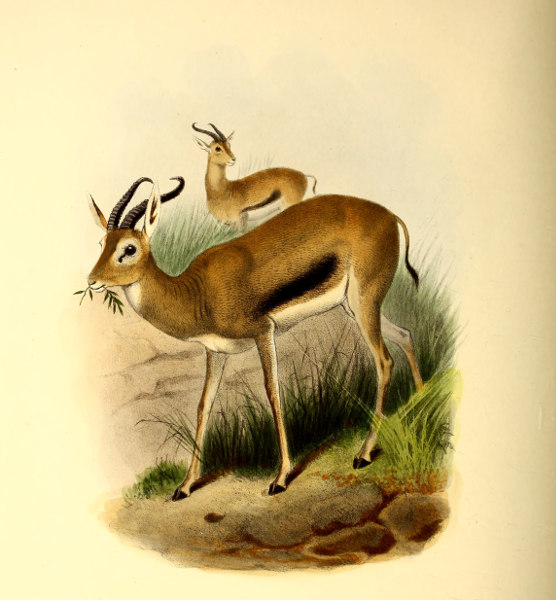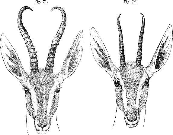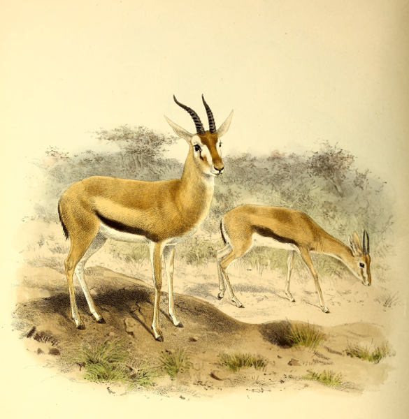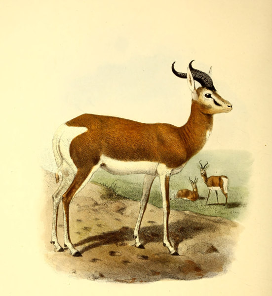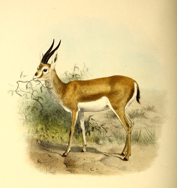 [3] This species may be taken as the type of Gazella, as being the only one which is common to Lichtenstein’s original genus and to Blainville’s “Gazella” of 1816. The latter author is ordinarily quoted as the original founder of the name, and his list includes the best known species—G. dorcas. But Lichtenstein’s genus, two years earlier in date, does not contain G. dorcas at all, and the only way in which the name Gazella can be properly retained for this group is by regarding G. subgutturosa as its type.