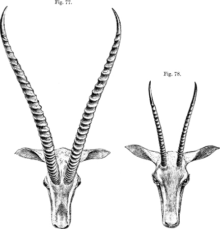 It was six years after the publication of Brooke’s paper before any additional information concerning this strange Antelope was obtained. In November 1884 Sclater brought before the notice of the Zoological Society a series of flat skins of Mammals, prepared by the natives of Somaliland, which had been lent to him for examination by Mr. C. Hagenbeck, of Hamburg. Amongst these were two skins, at first believed to belong to a new Gazelle, but which, after much research and mainly by the aid of a mounted head obtained in Somaliland by the late Mr. F. L. James, he was enabled to prove must belong to the same Antelope on the skull of which[232] Gazella walleri had been founded. The skins were at once distinguishable by the well-defined dark brown dorsal stripe which, as we now know, forms such a noticeable feature in the present species. Further evidence of the identity of the Somaliland Antelope with Gazella walleri was obtained by the comparison of Mr. James’s specimen with one of the typical skulls of the last-named species. They differed little, except in the slightly larger size of the northern specimen and in some other minor characters. It was thus first shown that the range of Waller’s Gazelle extends to Northern Somaliland, but we now know that the “Gerenuk,” as the Somalis call it, is one of the most abundant game-animals of that favoured land.