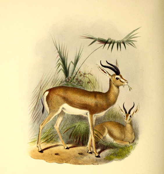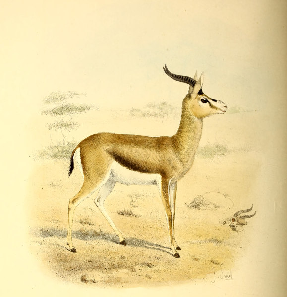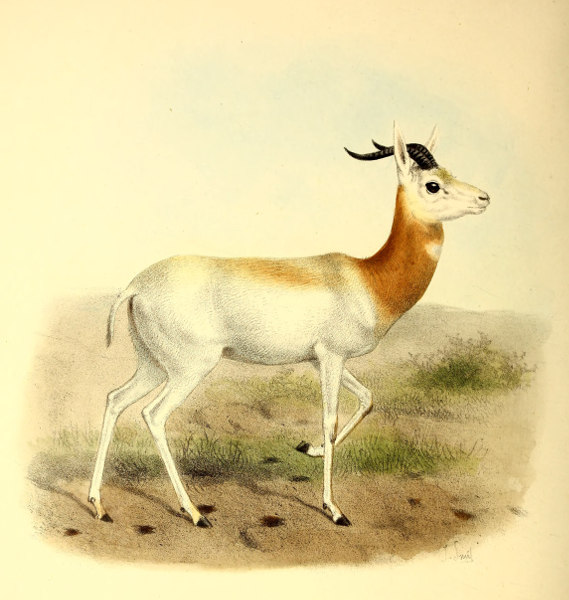 “The whole colour of this Gazelle is very beautiful in its tints of buff, purple, fawn, and grey and white; but what struck us most was their ears and hoofs. The ears, besides being very large and ornamental, are remarkable for the distinct rayed marking on the inside. The hoofs are well worth a special drawing, as they differ from those of any other Antelope with which I am acquainted. They are very much hollowed out, as is very noticeable in the track which they leave. The foot of the stuffed specimen in the Natural History Museum is filled up with some black substance which does not seem to me to be natural.”