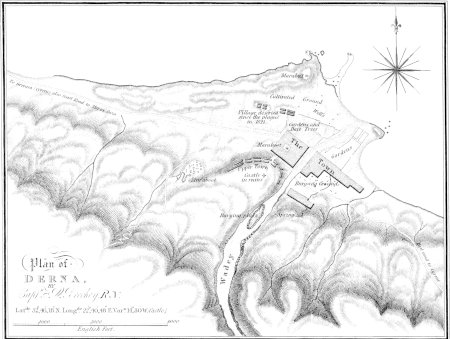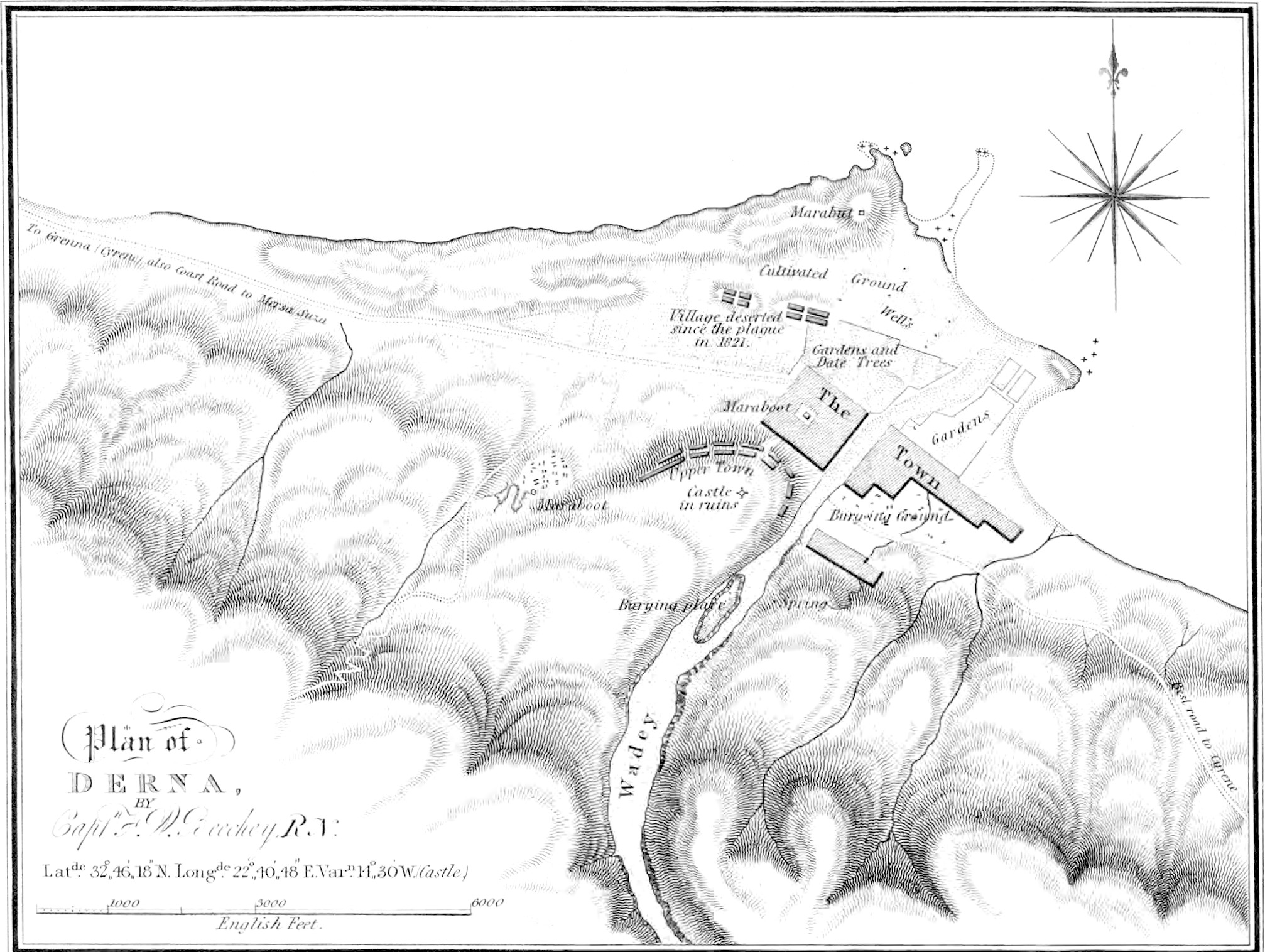 | The Rainy Season sets in at Bengazi towards the middle of January, and continues with little interruption till the beginning of March — Miserable Condition of the Town during that period — Construction of the Houses — Improvidence of the Arabs — Dirty state of the Streets — Swarms of insects which infest them — Position of Bengazi — Description of its Harbour — Castle of the Bey — Visit to Bey Halīl — Friendly Reception of our Party by his Excellency — Occupations and arrangements during the Rainy Season — The Shekh el Belad Mahommed — Jews of Bengazi — Trade of the Town — Produce of the Environs — Wretched state of the Bullock Vessels — Mahometan Inhabitants of Bengazi — Alarm of the Lower Classes during our residence there — Confusion resulting from it — Mob collected at our door on this occasion — Narrow Escape of Mr. Giacomo Rossoni — Friendly Conduct of our Mahometan Acquaintance — Parley with the Arabs — Dispersion of the Mob — Prejudices of the Arabs respecting the Treatment of Diseases — Fatal Effects of this species of Folly at Bengazi — Prevalent Diseases[xiii] in Bengazi and its vicinity — Singular cause of Alarm among a Party of Arab Shekhs — Arab notions of decorum and propriety contrasted with those of European Nations — Bengazi supposed to occupy the Site of Berenice and Hesperis — Existing Remains there — Little regard manifested by Turks and Arabs for the relics of Antiquity — Probable Limits of Berenice — Quarries, and singular Chasms in its Neighbourhood — Gardens of Hesperides — Position of the Gardens according to Scylax, Pliny, and Ptolemy — Conjectures of Gosselin and others respecting them — Circumstances which appear to favour our position of the Gardens — Lakes and Subterranean Caverns in the Neighbourhood of Bengazi, (or Berenice) — Concealed Body of Water observed in one of the latter — Examination of the Caverns — Remarks of the Bey respecting it — The Subterranean Stream in question considered as the River Lathon, or Lethe — Testimonies of the Ancients on this point — Supposed Communication of the Subterranean Stream with the Lake adjoining the Harbour of Bengazi — Signification of the term Lathon alluded to — Further Remarks in confirmation of our suggested Position of the River, and of its probable Communication with the Lake above mentioned — Remarks of Strabo and Cellarius on the subject — Temple of Venus, and Lake Tritonis of Strabo — Remarks on the name Berenice — Total ignorance of the Arabs of Bengazi with respect to the former celebrity of their City — Pleasing little Fable of Kazwini, on the changes which take place in the Nature and Appearance of Places, and the little knowledge which remains, after a lapse of time, of their former Condition, even on the spots where they existed | 281 |