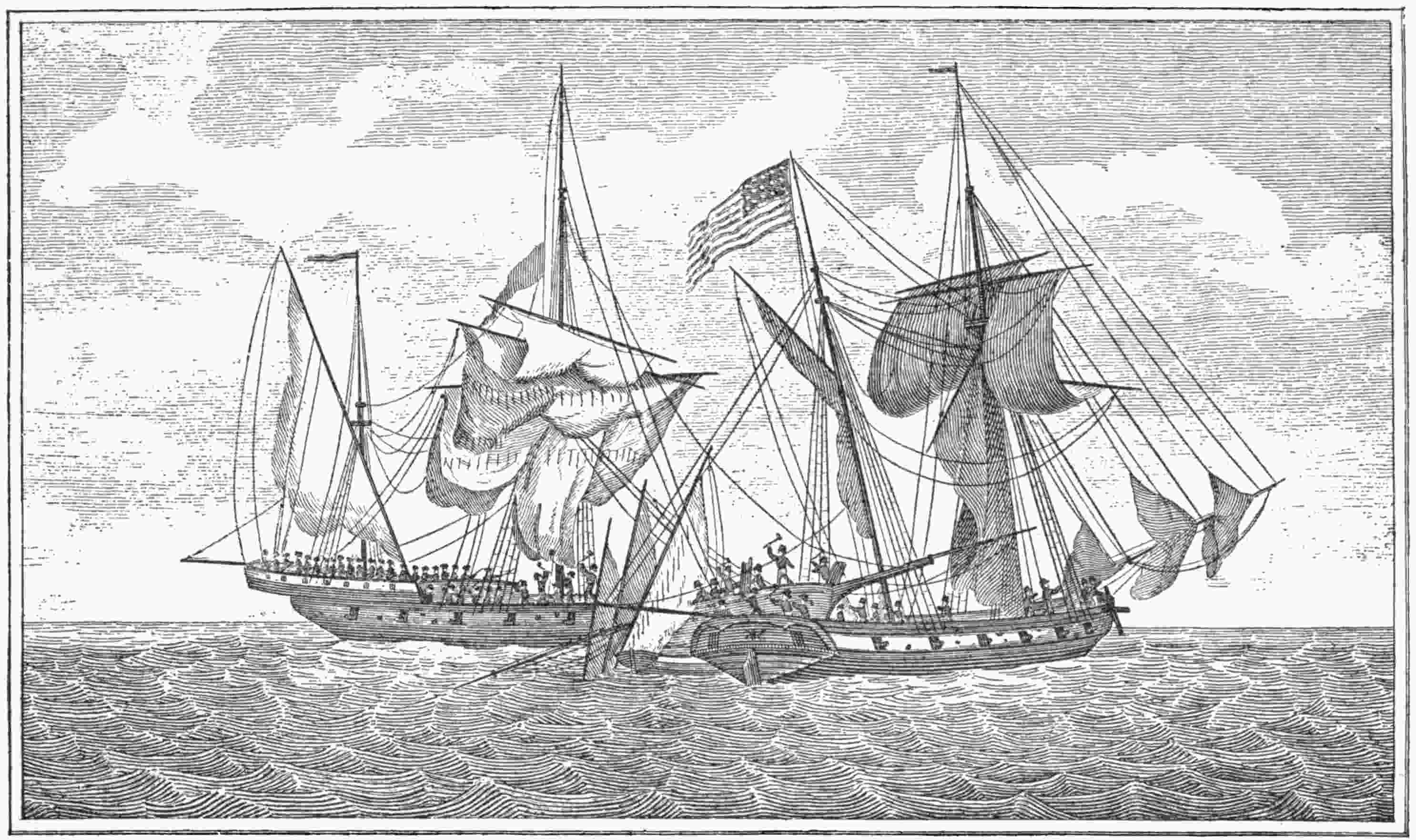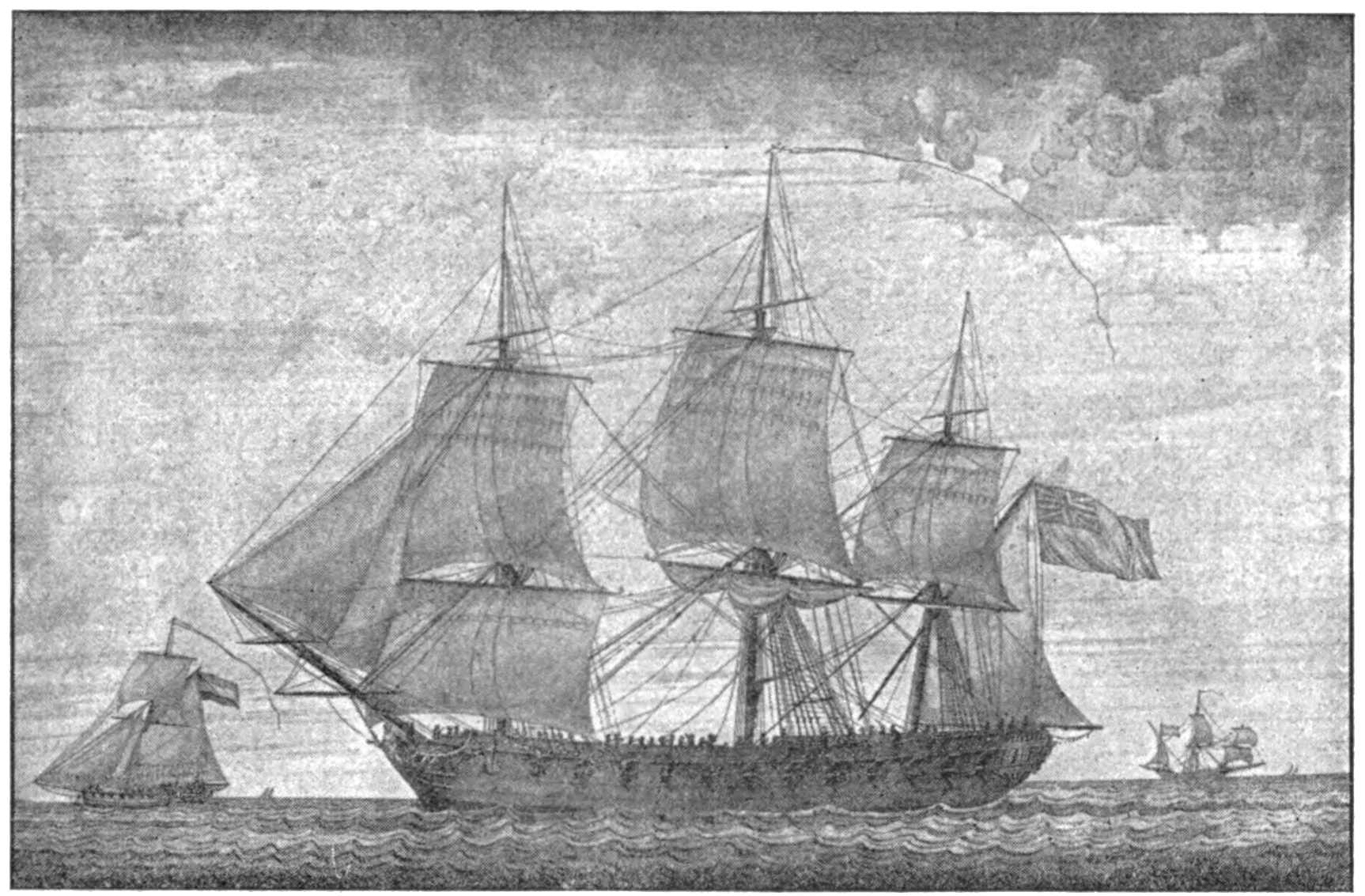 On November 16, 1798, while en route on this passage, the convoy fell in with a British squadron consisting of two seventy-four-gun ships-of-the-line, one ninety-eight-gun ship-of-the-line, and two thirty-two-gun frigates. Because both Great Britain and the United States were then at war with France, the two nations were, of course, allies at this time. Nevertheless, knowing that the British ships were sure to be anxious for more sailors, Captain Phillips signalled his fleet to square away before the wind, and so get out of reach, while he bore up to have a talk with the Englishmen.