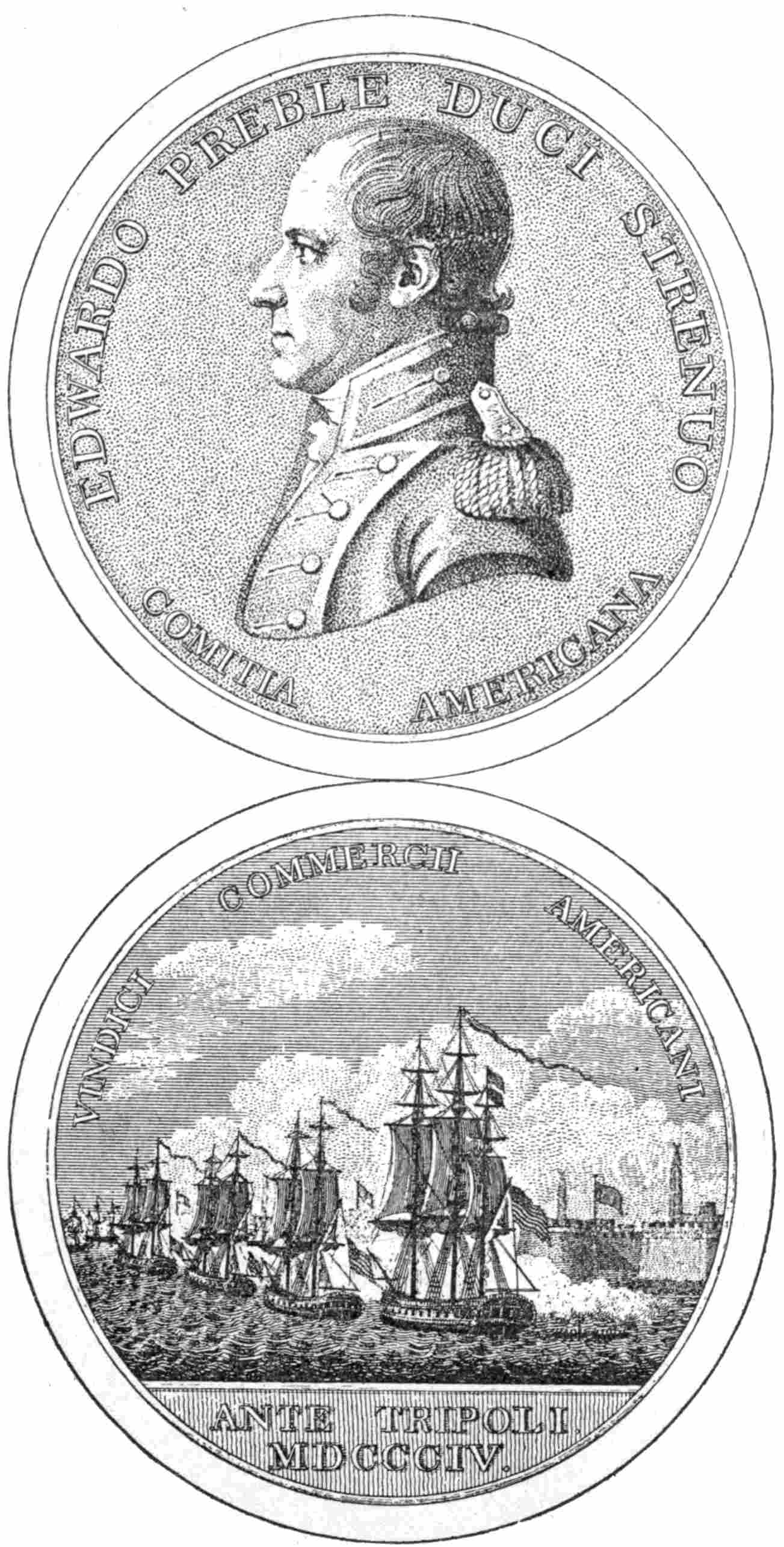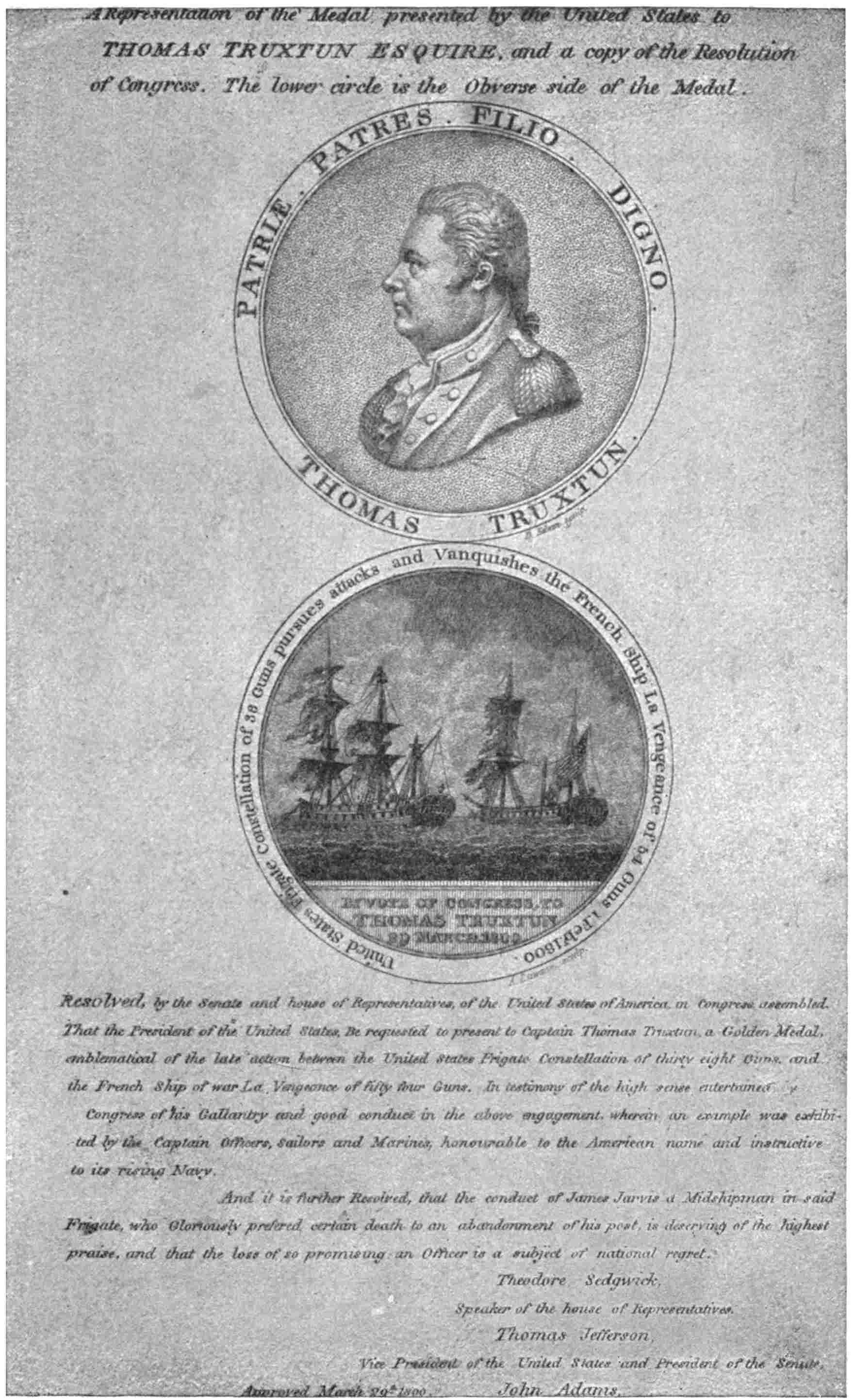 Other attacks on the city followed. The Congress gave Preble a gold medal, each of his officers and midshipmen a sword, and all others of the crew a month’s pay because of their good work there. The force was increased by other ships until there were five frigates, a brig, three schooners, a sloop, and a dozen or so gunboats and bomb barges in the fleet, making the most powerful squadron that had ever assembled under the flag. For that day and place it was an impressive display of the sea power. In the meantime a formidable uprising had taken place in the Bashaw’s dominions, and the capital of his chief province was captured by the leader of the revolt with the aid of the Americans. So the Bashaw became alarmed and eventually offered to deliver up all prisoners for a ransom of $60,000 and to agree never again to trouble American commerce. This offer was accepted, and peace followed. The fleet then sailed to Tunis, whose ruler, stimulated by the British consul-general, had expelled the American agent. To him terms of peace were dictated under the muzzles of the379 guns of the fleet. And that was a matter of wonder to the nations of Europe, for never had380 such a thing been done before. So closes the story of the American navy’s work during the period between the Revolution and the War of 1812.