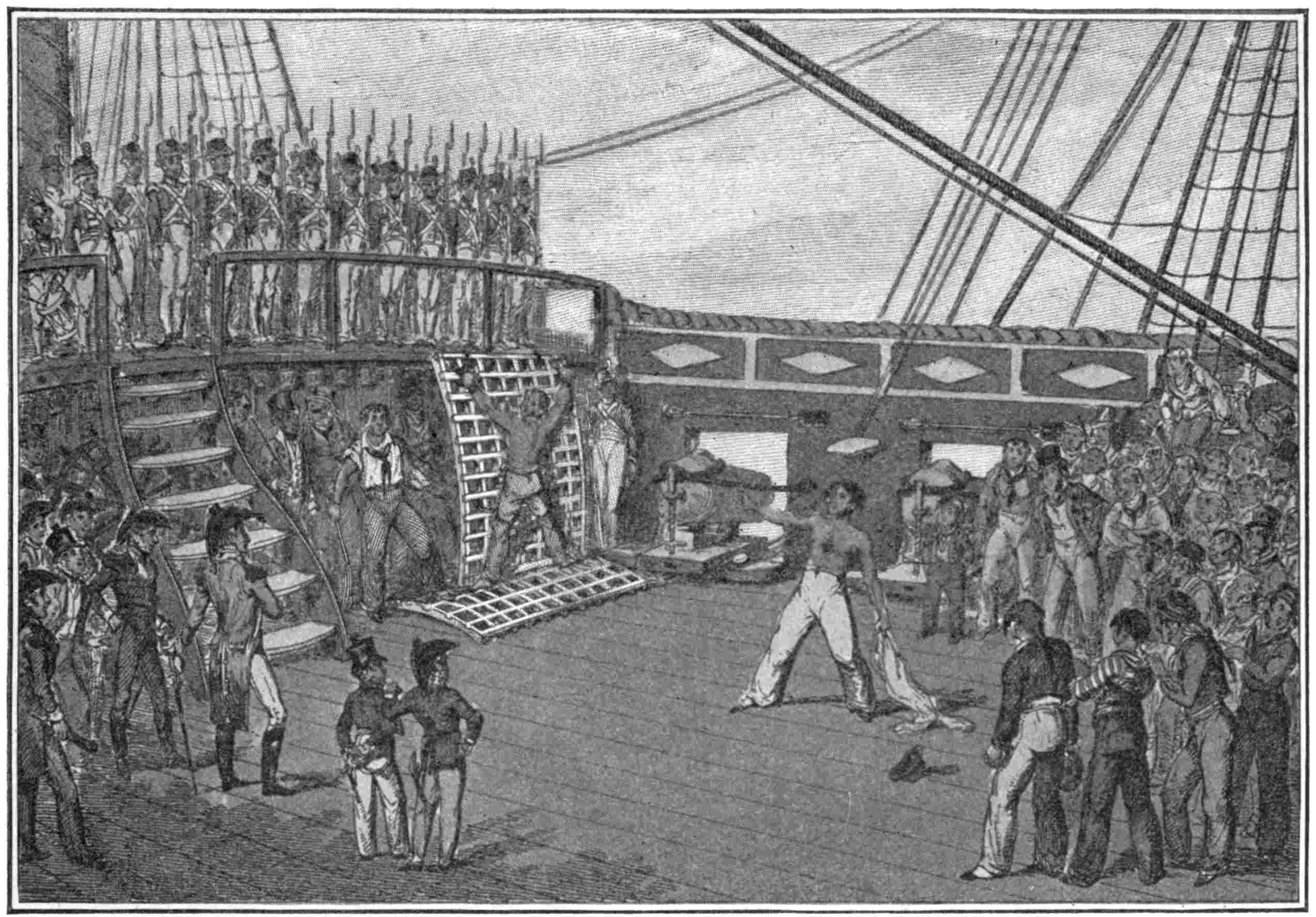 On the day appointed the Macedonian’s launch was put into the water and rigged, under the supervision of this David Hope, with a frame on which the bare-backed sailor was lashed. A surgeon, to keep watch that the man was kept alive, boarded the launch with the boatswain and the boat’s crew, and then all hands were called to man the rail and rigging, where all could view the torture.