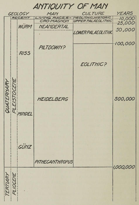 | 7. The “Missing Link.”—8. Family tree of the Primates.—9. Geological and glacial time.—10. Place of man’s origin and development.—11. Pithecanthropus.—12. Heidelberg man.—13. The Piltdown form.—14. Neandertal man.—15. Rhodesian man.—16. The Cro-Magnon race.—17. The Brünn race.—18. The Grimaldi race: Neolithic races.—19. The metric expression of human evolution. | |