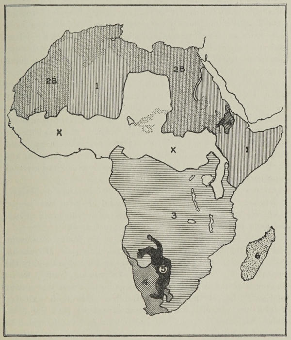 This does not mean that all constituents of African culture have their origin in Egypt; still less that the colors or patterns of African cultures can be derived from that country. However great a bulk of culture may be absorbed by one people from another, the organization which is given this, the stamp put upon it, is necessarily more or less distinctive, because the introduced constituents meet others already established; and especially because the recipient culture, even if low, already possesses a form of its own into which it unconsciously attempts to fit the new content, and into which, unless the influx is sudden and great, it usually succeeds in fitting the imports for a time.[499] However, any specific culture trait common to ancient Egypt and the modern Negroes is suspect of a common origin, which ordinarily—though not universally—would mean an Egyptian or more remote origin. Yet the resolution of such a suspicion is not always easy. Much depends on the extent and continuity of the geographical distribution of the trait, and on the actuality and specificity of the resemblance. On these points the necessary information is often still incomplete.