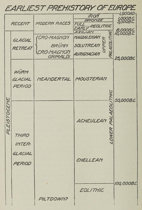 [32] So primary is the distinction within the Palæolithic of its Lower and Upper halves, that some authors, for purposes of elementary presentation, have felt justified in calling these halves the Old and the Middle Stone Ages. This is unfortunate because this “Middle” Stone Age is in scientific writings always included in the Palæolithic, whereas the Mesolithic or Middle Stone Age of many archæologists embraces the more or less transitional periods such as the Azilian and Maglemose (below, § 216) between the end of the Palæolithic and the definitive or Full Neolithic. Nevertheless, the unorthodox terminology has the merit of condensing detail with a broad sweep.