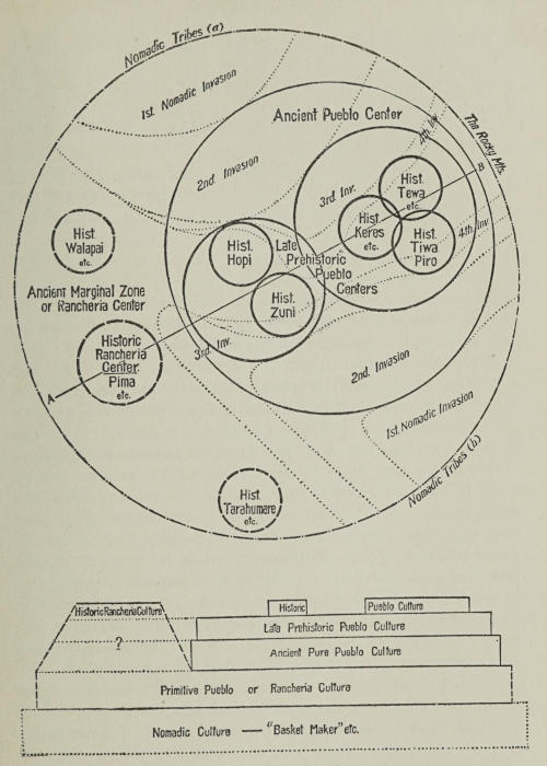 [13] Of course this does not mean that the tribes beyond the edge are without culture. They would normally be under influences from other centers. And in a certain degree every people possesses initiative and is constantly tending to invent or produce culture, though perhaps only of a simple order. It is only from the point of view of the Southwest and its Pueblo focus that the extra-marginal tribes possess a zero culture.—For examples of other cultural step pyramids, see § 164, 175, Fig. 35.