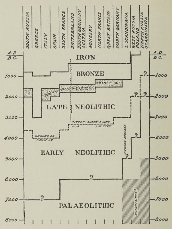 [12] A period known as the Azilian, dated about 10,000-8,000 B.C., usually included in the Palæolithic, is discussed in chapter XIV in connection with a review of the Palæolithic outside Europe and of the relations between the Palæolithic and Neolithic.