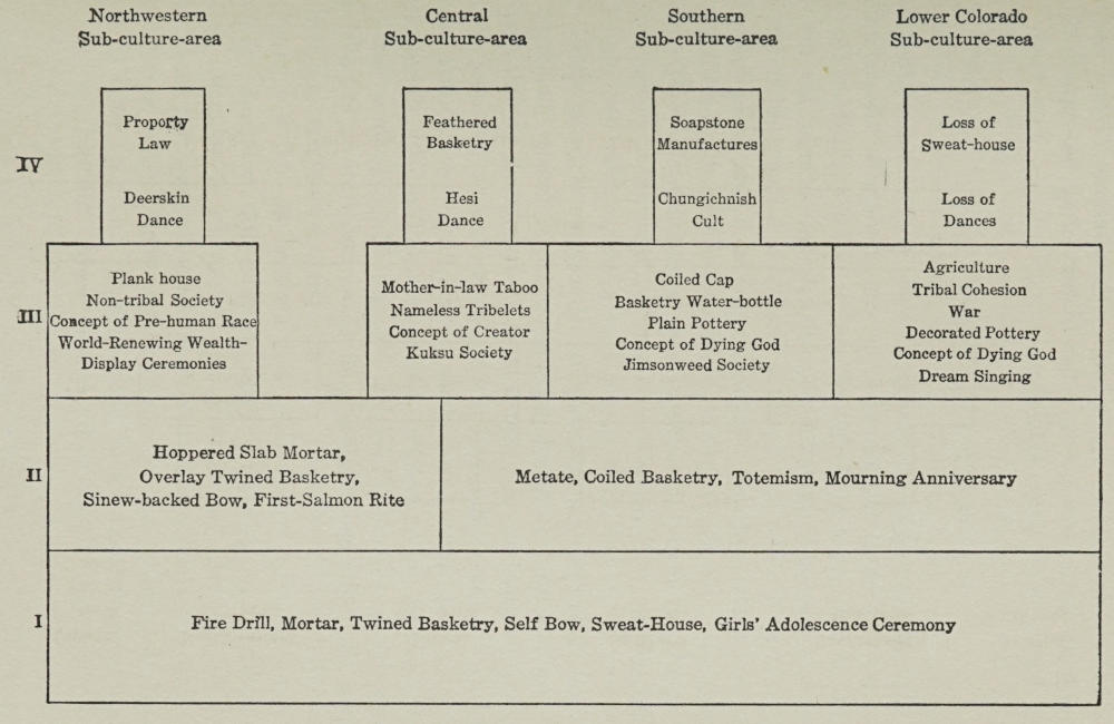 | 150. Regional variation of culture.—151. Plains, Southwest, Northwest areas.—152. California and its sub-areas.—153. The shaping of a problem.—154. Girls’ Adolescence Rite.—155. The First Period.—156. The Second Period: Mourning Anniversary and First-salmon rite.—157. Era of regional differentiation.—158. Third and Fourth Periods in Central California: Kuksu and Hesi.—159. Third and Fourth Periods in Southern California: Jimsonweed and Chungichnish.—160. Third and Fourth Periods on the Lower Colorado: Dream Singing.—161. Northwestern California: world-renewal and wealth display.—162. Summary of religious development.—163. Other phases of culture.—164. Outline of the culture history of California.—165. The question of dating.—166. The evidence of archæology.—167. Age of the shell mounds.—168. General serviceability of the method. | |