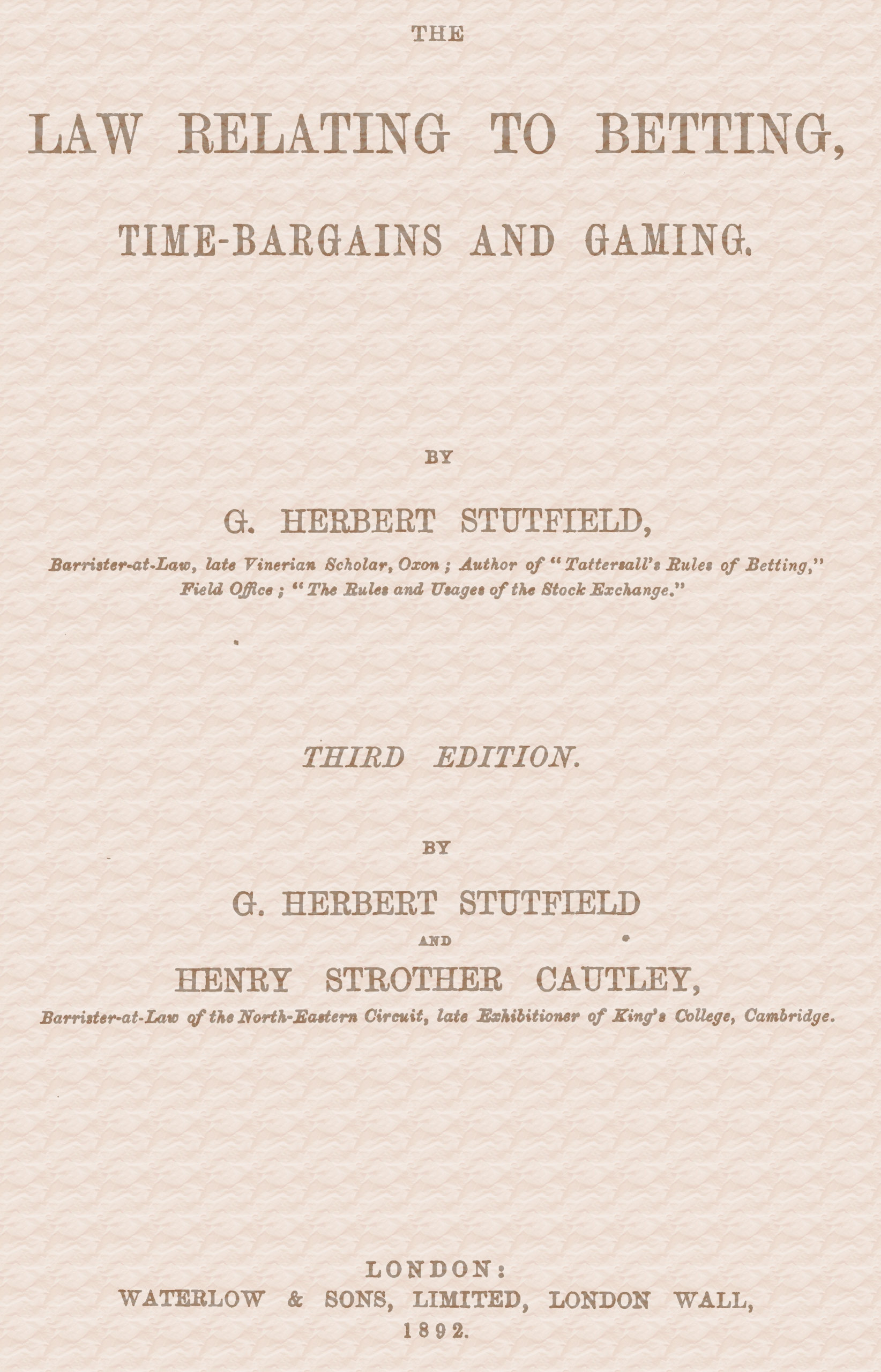 One blank the Authors have endeavoured to fill. Great difficulty seems constantly to be experienced by those who have to do with the gambling laws, whether as judges, counsel or gamblers, owing to the absence of a clear understanding of various legal conceptions, such as “wager” and “lottery.” Authoritative description or definition there certainly is none. To define is proverbially hazardous and difficult. But an attempt is made in this edition to analyse the component parts of these two very difficult conceptions, thereby no doubt opening the door to numerous criticisms, but it is hoped at the same time throwing out some suggestions which may tend to prevent a confusion of ideas.