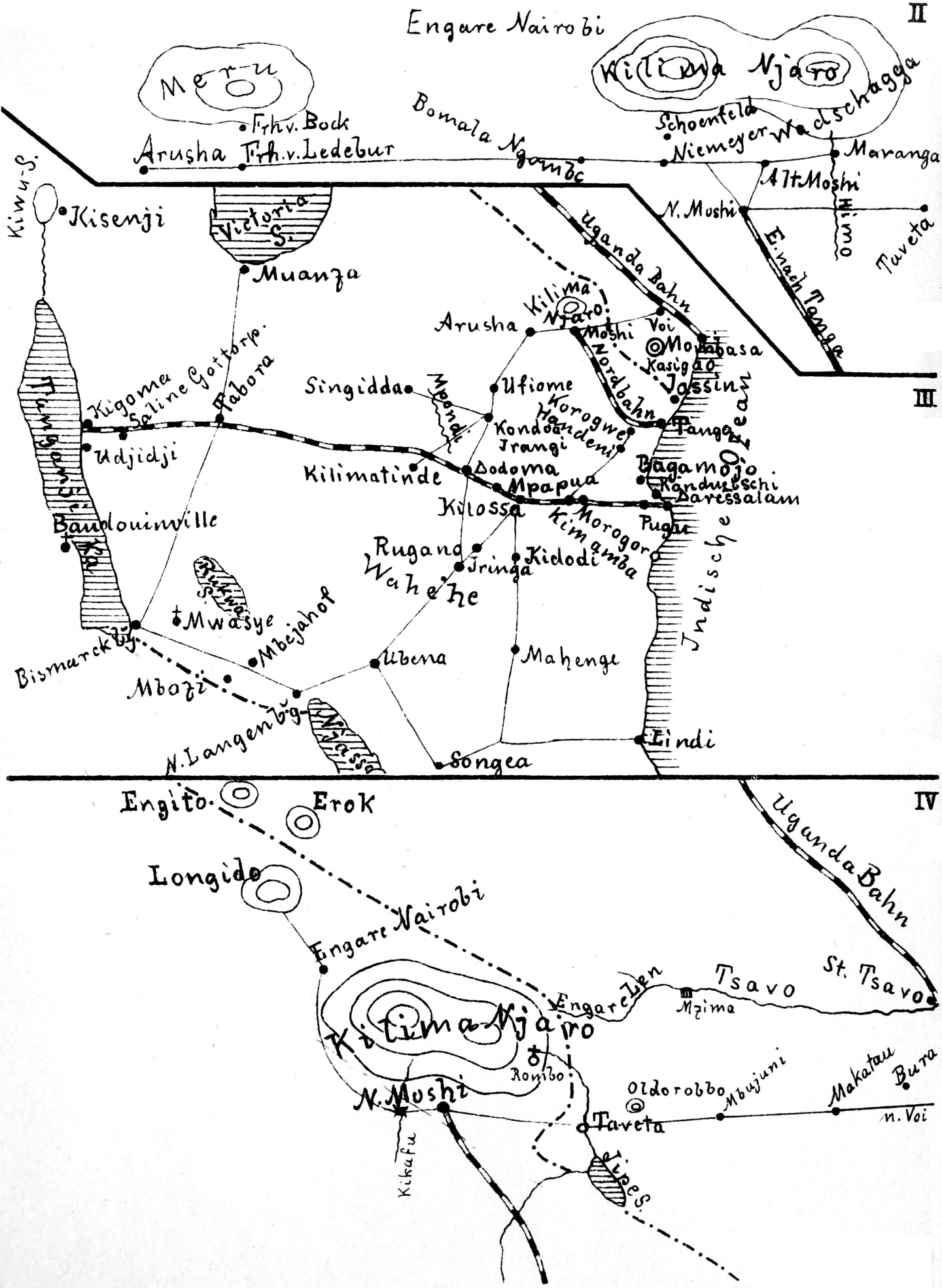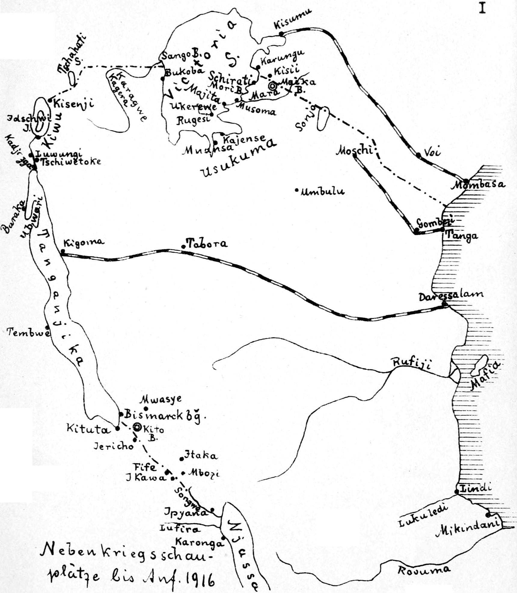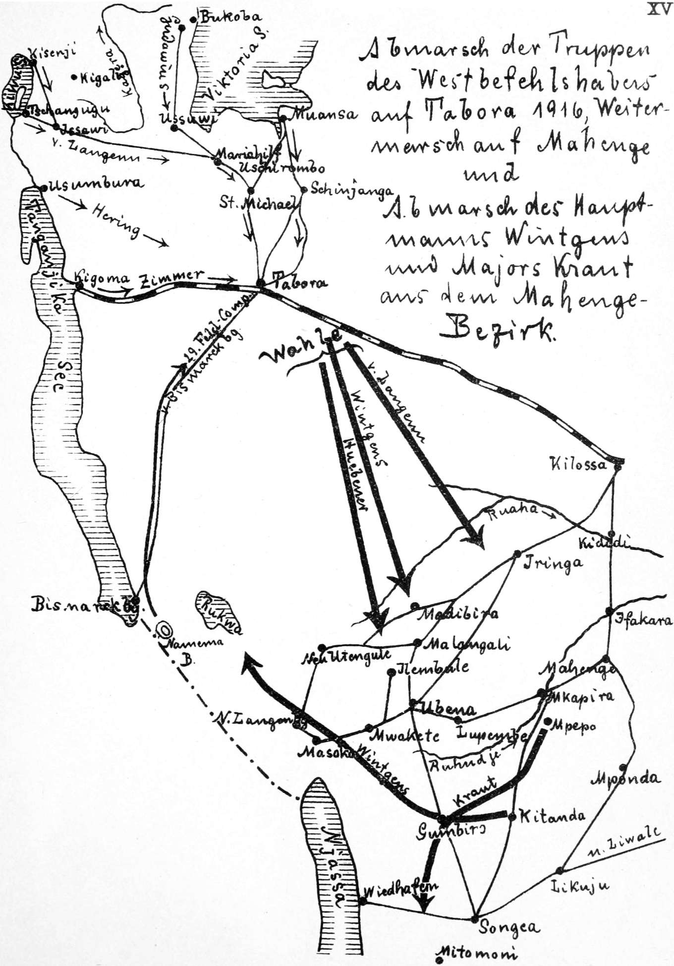 Der Schiffstransport feindlicher Truppen zum Nordende des Nyssasees und ihr Vormarsch auf Ubena oder weiter nördlich war recht wahrscheinlich und hat sich später auch als zutreffend erwiesen. Wollte ich die Marschrichtung auf Tabora abbrechen und zwischen dem Nyassa- und Rukwasee und später zwischen dem Nyassa- und Tanganjikasee hindurch nach Rhodesien marschieren, so rückte jetzt der Zeitpunkt zum Abbiegen heran, und ich durfte keinen Tag verlieren, um so mehr, als die schroffen Züge des Livingstonegebirges sowie die Berge um Mbeja die Bewegungsfreiheit sehr beschränkten. Bei der Festlegung der Marschroute war zu berücksichtigen, daß die Verpflegungsbestände der Kompagnien stark zusammengeschmolzen waren und ergänzt werden mußten. Die Möglichkeit hierzu bot, nach Eingeborenenaussagen, die Gegend von Kidugala und Gombowano, während in Ussangu, insbesondere bei Neu-Utengule, Hungersnot sein sollte.