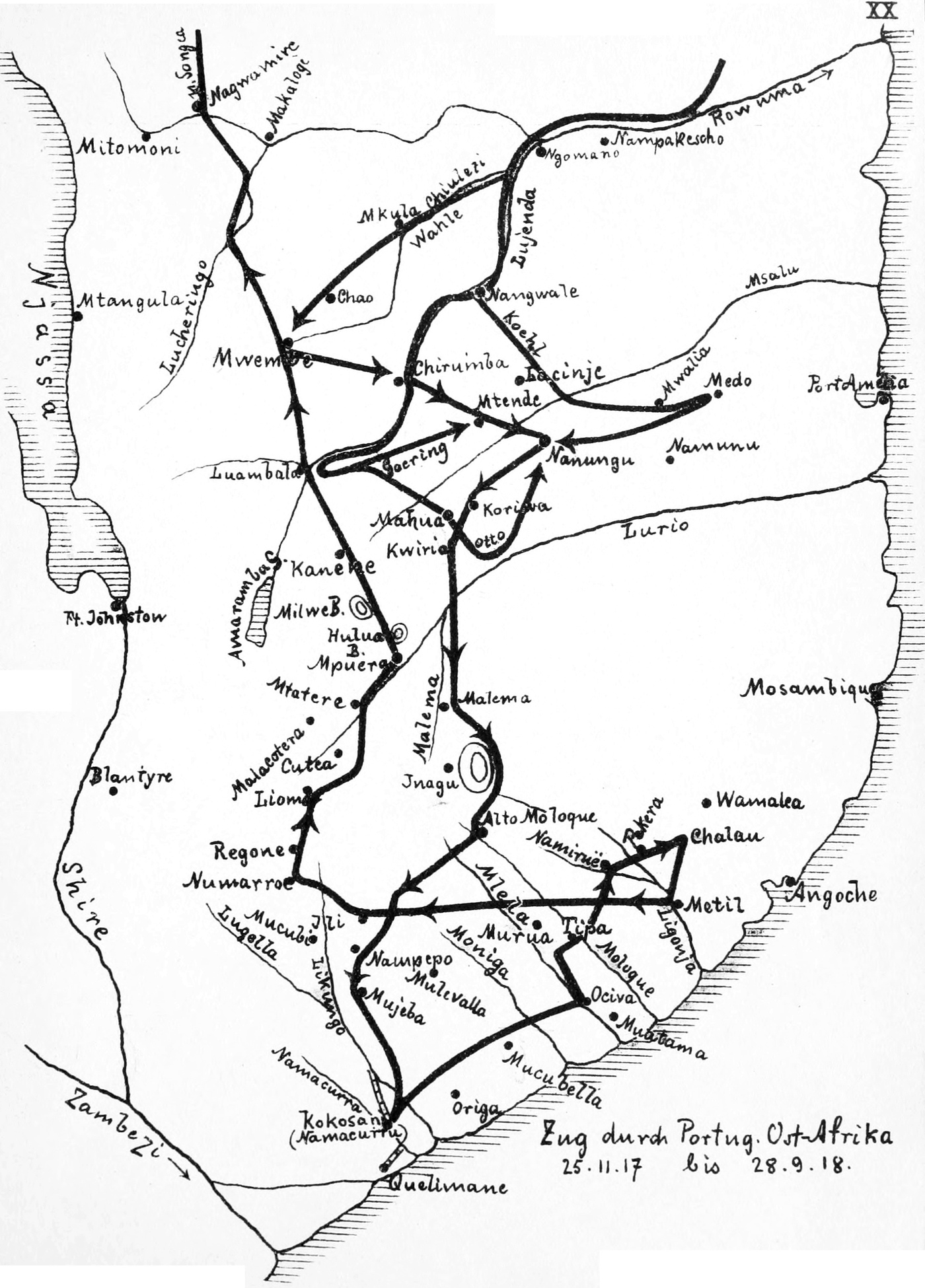 Fernpatrouillen von uns wurden nach Mitomoni und nach Makalogi gesandt. Südlich des Rowuma führte uns der Marsch nach Verlassen des Luscheringotales quer durch eine außerordentlich wildreiche Steppe, und ebenso war es am Rowuma selbst, den wir am 28. September erreichten. Aber der Wildreichtum hatte auch seine Nachteile; wieder einmal wurde ein Posten von Löwen geschlagen. Wir betraten wieder deutschen Boden und blieben bei Nagwamira zwei Tage; mehrere feindliche Magazine und Transporte, die über unser Erscheinen nicht unterrichtet waren, wurden überrascht. Die Landschaft war außerordentlich reich, und die Truppe konnte sich gründlich erholen. Unsere nach Mitomoni gesandten Patrouillen meldeten dort ein stärker befestigtes Lager und das Eintreffen von Verstärkungen, die von Westen her kamen. Auch Ssongea war vom Feinde besetzt, seine Stärke allerdings nicht festzustellen. Die verschiedenen Nachrichten, sowie die[S. 280] geographische Lage machten es wahrscheinlich, daß auch nach Ssongea, vom Nyassasee her, Verstärkungen unterwegs waren.