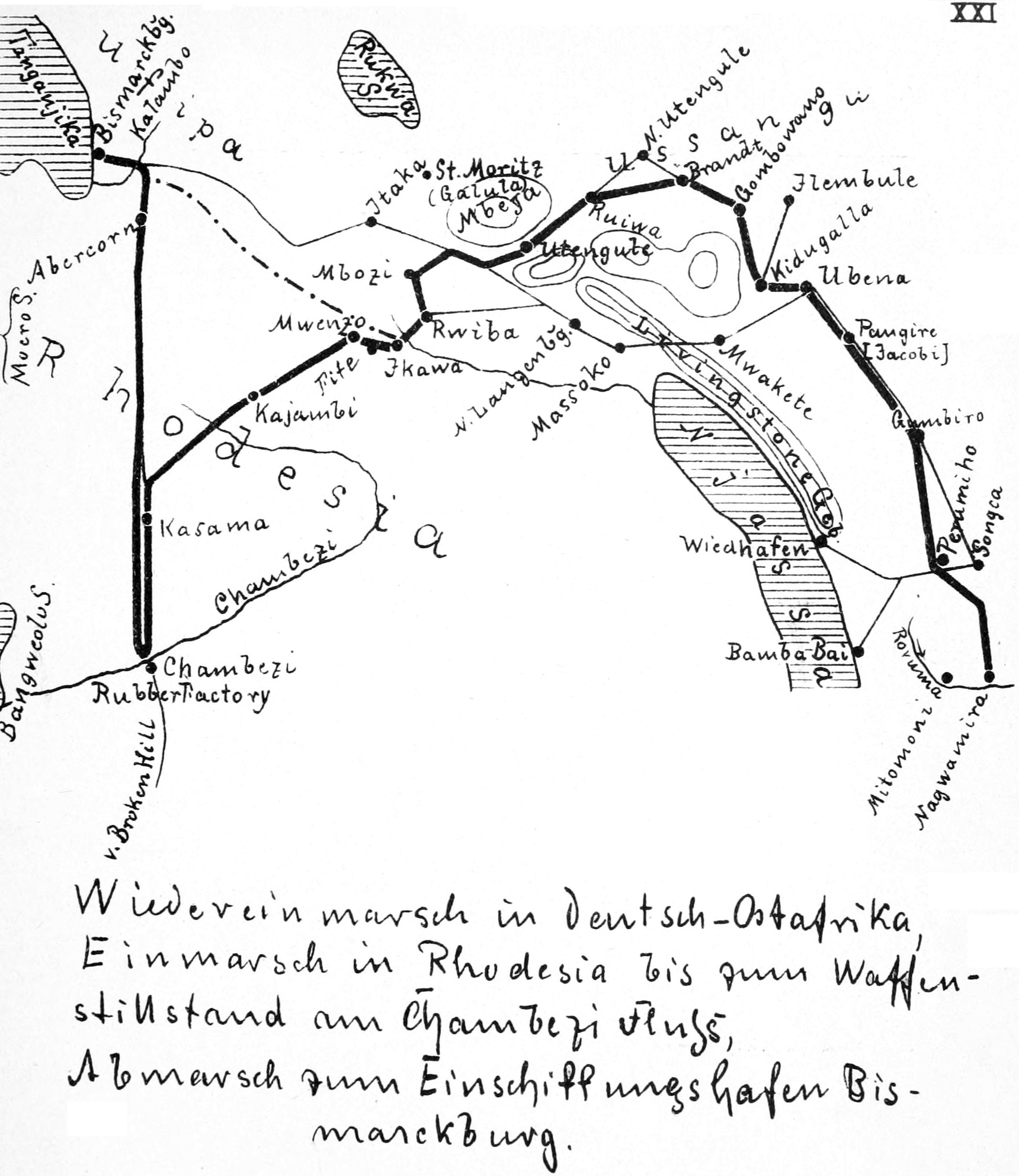 Wir marschierten nun in kleinen Märschen über Kasama auf Abercorn zu. Britischerseits wurden uns Einzelheiten über die Waffenstillstandsbedingungen bekannt gegeben. Es stellte sich heraus, daß in diesen nicht „bedingungslose Übergabe“, wie General van Deventer ursprünglich mitgeteilt hatte, verlangt war, sondern „bedingungslose Räumung“ (evacuation). Gegen die Auslegung des englischen Kriegsamtes, daß das Wort evacuation die Übergabe und Entwaffnung einbegriffe, erhob ich mehrfach Einspruch, habe aber weder von den Regierungen der alliierten Länder und der Vereinigten Staaten noch von der deutschen Regierung Antwort erhalten. Ich habe mir überlegt, ob ich bei dieser zweifellosen Entstellung des Wortes evacuation mich auf nichts Weiteres einlassen und zu den Belgiern oder sonst wo anders hinmarschieren sollte. Aber schließlich war im Vergleich zu der Gesamtheit der Friedensbedingungen die die Schutztruppe betreffende Klausel ein so geringer Punkt, daß ich beschloß, nach Daressalam zu rücken, wie General van Deventer es verlangte, allerdings in der Erwartung, daß die Engländer uns von dort den Bedingungen des Waffenstillstandes entsprechend sogleich weiter in die Heimat transportieren würden. Diese Erwartung wurde, wie sich später herausstellte, nicht erfüllt.
