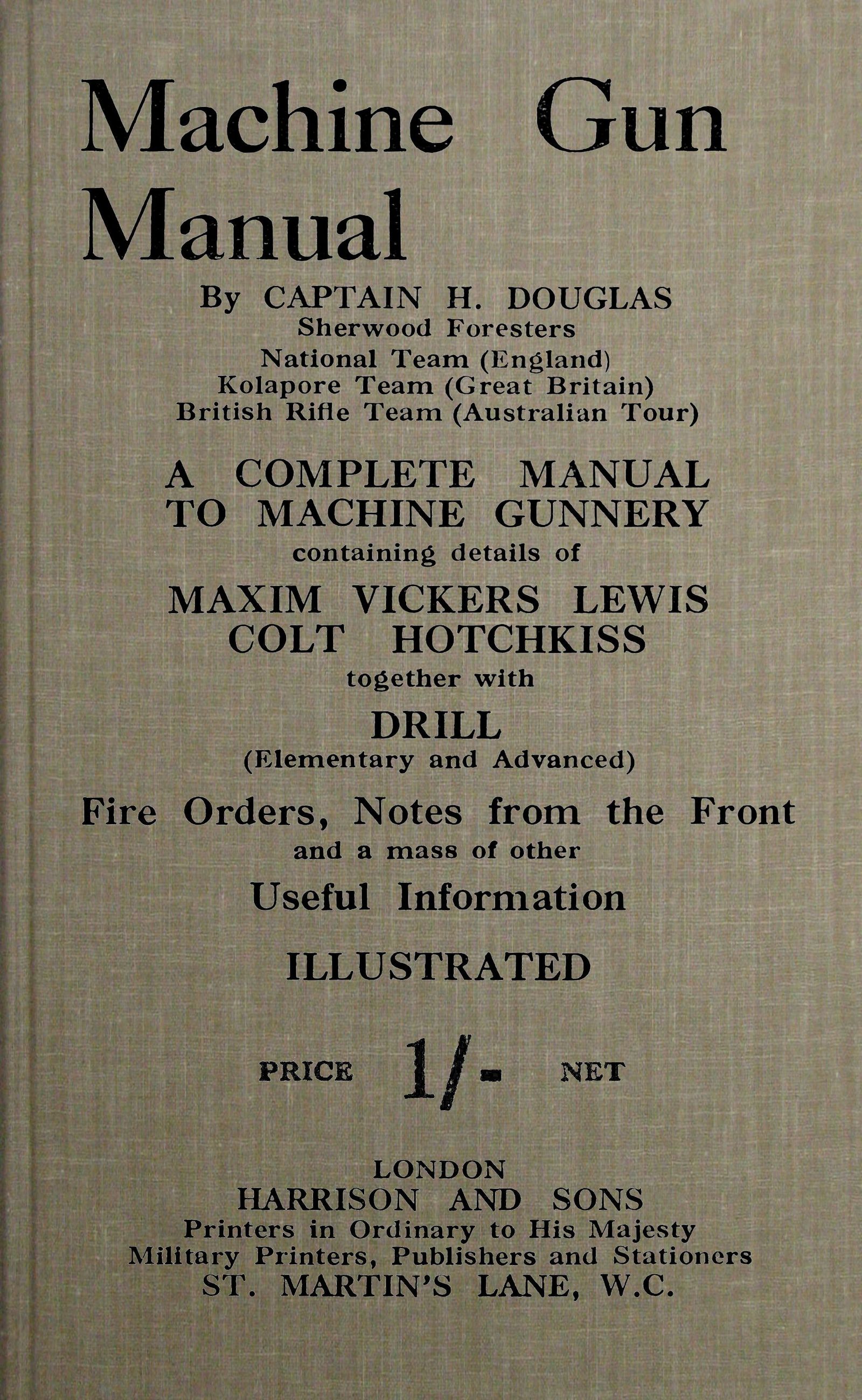 a complete manual to machine gunnery, containing details of Maxim, Vickers, Lewis, Colt, Hotchkiss, together with drill (elementary and advanced) fire orders, notes from the front and a mass of other useful information