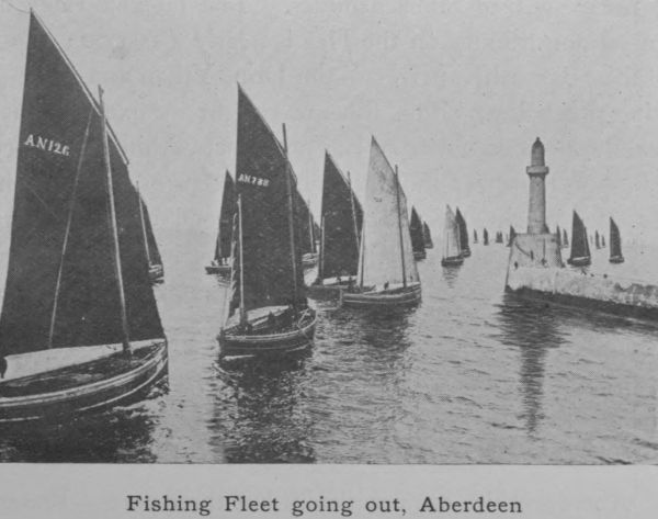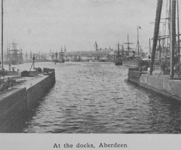 The chief street of the city is Union Street created a century ago at a cost which was considered reckless at the time but which has been more than justified by the results. This first improvement scheme, which has been followed up by others in recent times, was the work of men with a wide outlook. Prominent among the Provosts of enlightenment was Sir Alexander Anderson, whose name is now at the eleventh hour stamped in memory by the Anderson Drive—a fashionable west-end thoroughfare. Union Street is the backbone from which all the other thoroughfares radiate. It is broad and handsome and the buildings that face each other across it are as a rule worthy of the street. Union Bridge, one of Fletcher’s graceful structures, with a span of 130 feet, makes a pleasing break in the line of buildings and permits a view north and south along the Denburn valley. The northern view, which shows Union Terrace and Union Terrace Gardens with handsome public buildings, both in the foreground and in the background, is undoubtedly one of the finest in the city. The Duthie Park on the north bank of the Dee, the links that fringe the northern coast, the picturesquely wooded amenities of Donside, above and below Balgownie Bridge, the quaint other world air of Old Aberdeen with its lofty trees, its grand cathedral and the ancient crown of King’s College, these are all elevating and meliorating influences that help to keep in check the commercial spirit that rules about the harbour-quays and the fish-market.