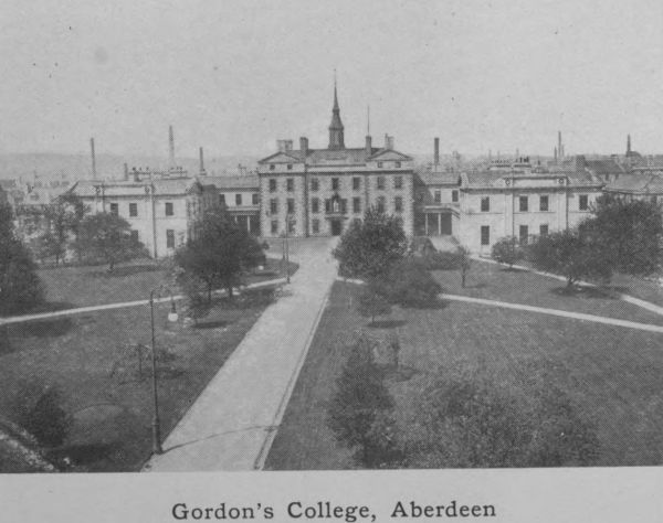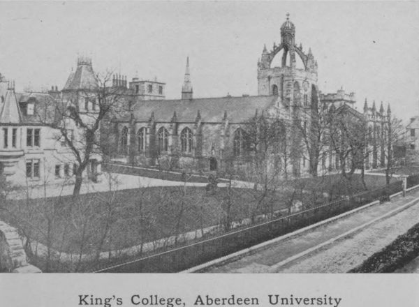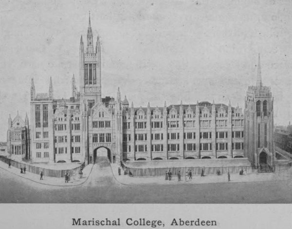 Aberdeen has long been a great educational centre. Its Grammar School claims to have existed in the thirteenth century.[179] Its first University, King’s College in Old Aberdeen, was founded in 1494 by Bishop Elphinstone, and its second, Marischal College in New Aberdeen, by Earl Marischal in 1593. These were united in 1860 as the University of Aberdeen. Since that time the buildings of both Colleges have been largely added to, and the number of professorships greatly increased. Its students in the different faculties, Arts, Medicine, Science, Law and Divinity are little short of 1000.