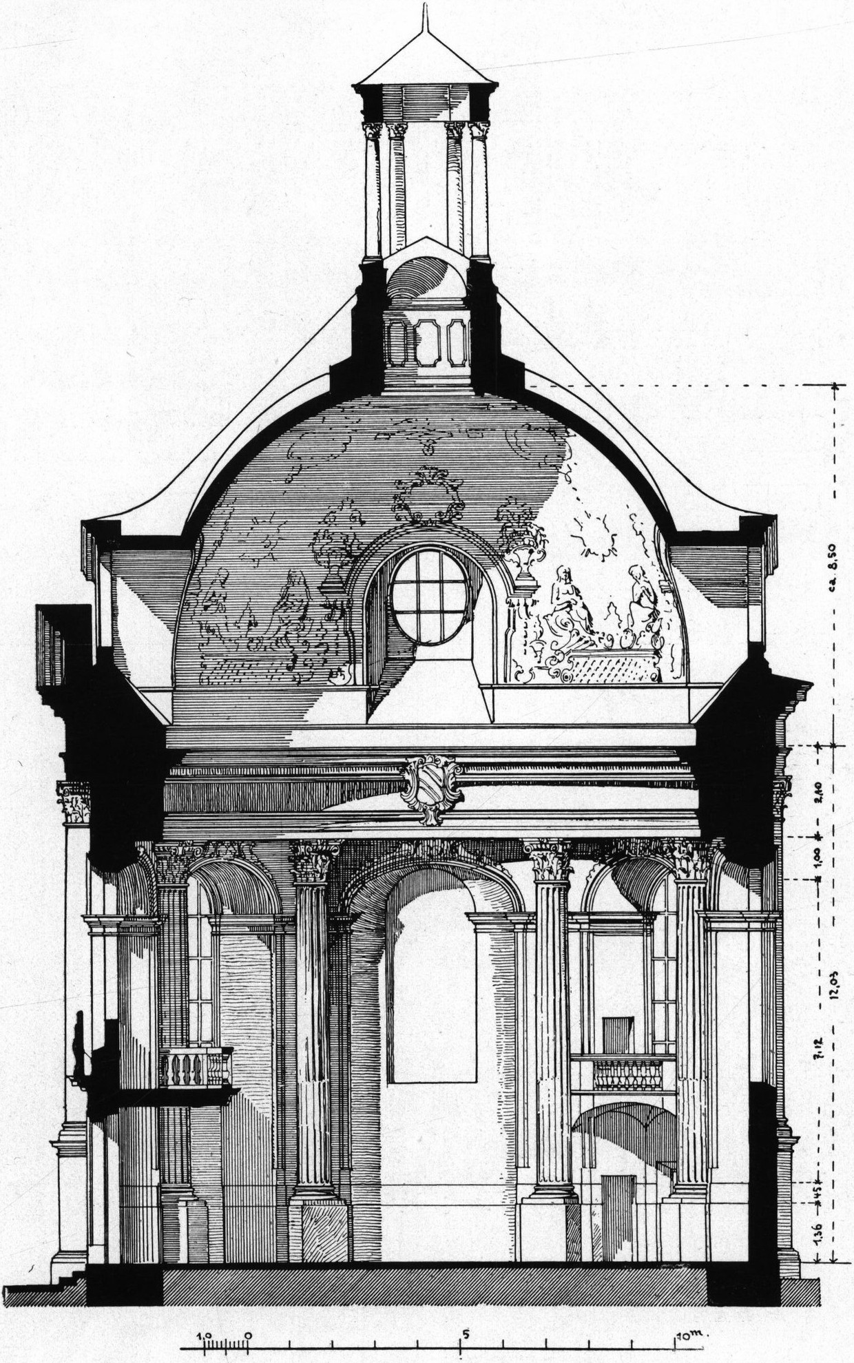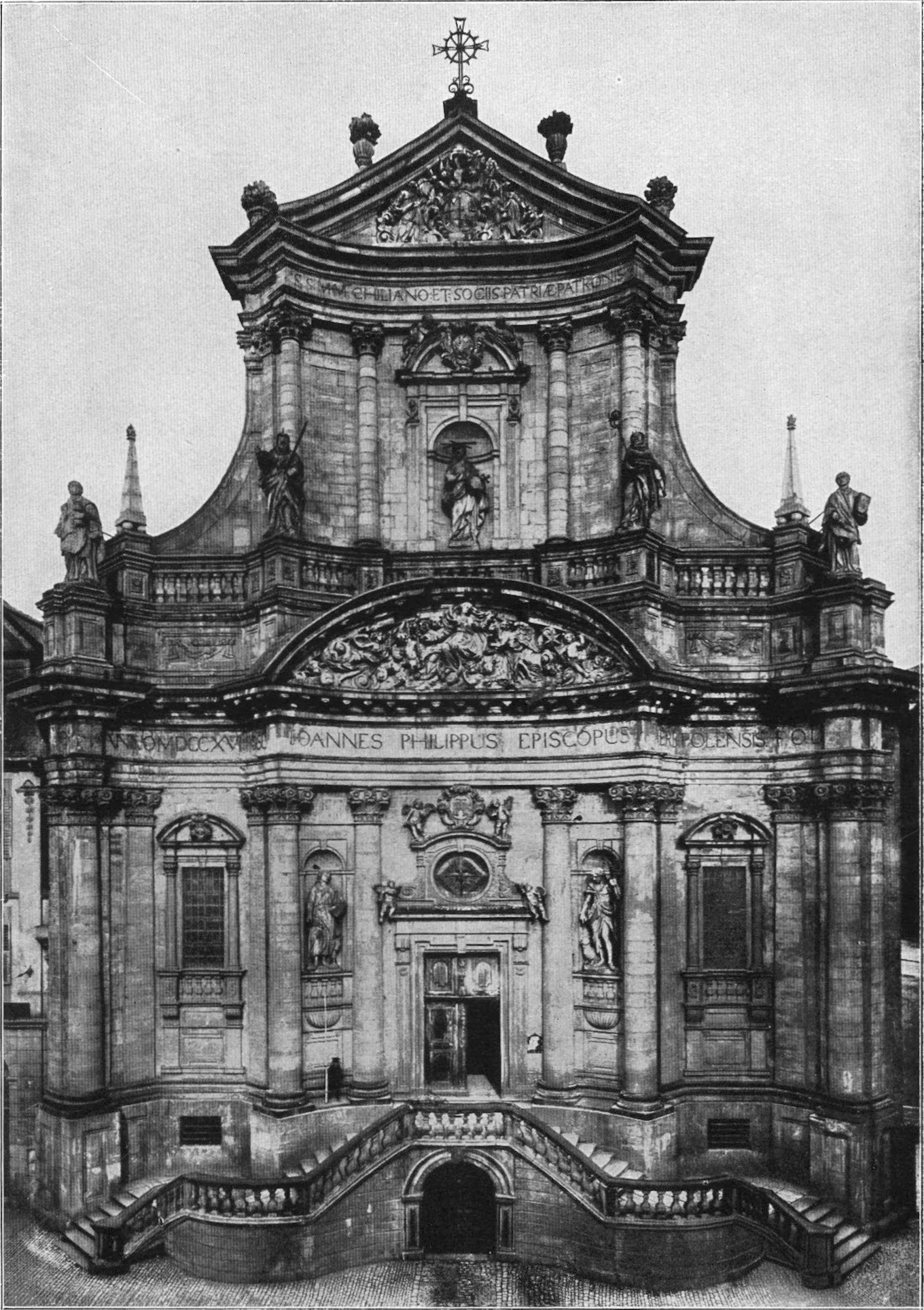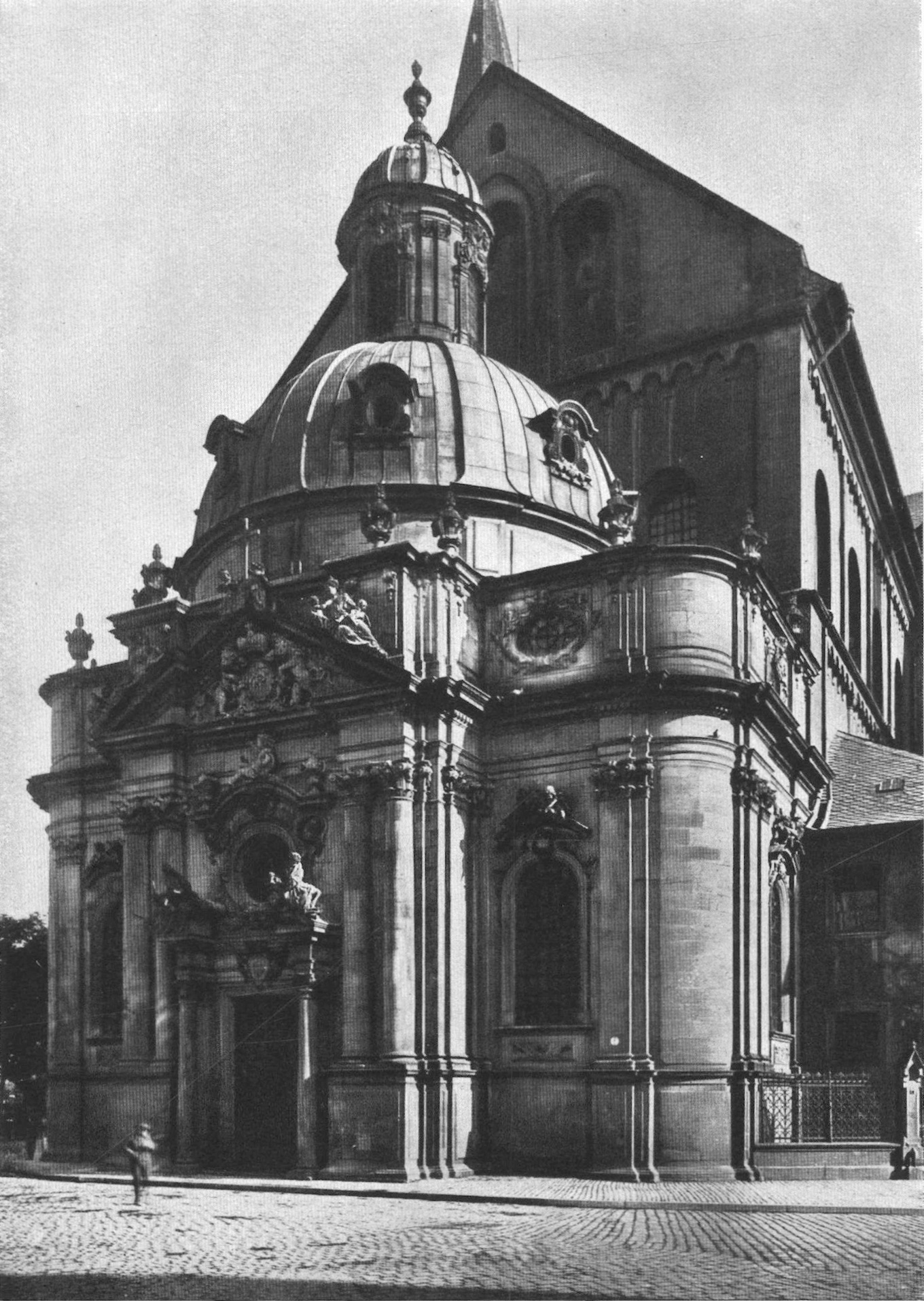 Um die Wende des Jahrhunderts setzt dann in Würzburg die barocke Bewegung mit breiter Front ein. Das Innere des Domes und der Neumünsterkirche wird zeitgemäß erneuert. Die Erbauung einer Domfassade, wozu u. a. Entwürfe von Welsch und Hildebrand vorliegen,[S. vi] blieb trotz mehrmaliger Wiederaufnahme der Angelegenheit nur ein Plan. Dagegen erhielt Neumünster eine prächtige Schauseite, die einen starken Stilfortschritt bedeutete. Die Massen werden hier von einer rhythmischen Kurvenbewegung durchschüttert, die von einem organischen Mittelpunkt auszugehen scheint. Ein neuer Bauausdruck und eine neue Anschauung von künstlerischer Einheit ist hier am Werke. Die besondere Art ihrer Ausprägung weist wohl auf einen maßgebenden Einfluß Johann Dientzenhofers hin, der ja als Vermittler der wichtigen böhmischen Anregungen für den fränkischen Kirchenbau von besonderer Bedeutung ist. Auch Joseph Greising wird bei der Fassadenplanung nicht ganz ausgeschaltet gewesen sein. Er führte ja den Neumünsterumbau und war zu jener Zeit ein angesehener und vielbeschäftigter Mann, der die Vorneumannsche Zeit am würdigsten vertritt. Würzburg war in jener und der unmittelbar darauffolgenden Zeit ein Brennpunkt vieler Strahlen, die aus dem Westen, Osten und Süden hier zusammentrafen. Besonders deutlich tritt dies beim Bau der Schönbornkapelle zu Tage. Sie ist ein Musterbeispiel damaliger Planungs- und Ausführungsarbeit, Ergebnis mannigfaltigen Zusammenwirkens von künstlerisch oft gegensätzlichen Persönlichkeiten. Immer neue Entwürfe treiben Baugedanken und -gestalt vorwärts, bis das Ganze schließlich in solchem Maße einheitlich vollendet dasteht, daß es nur aus dem genialen Haupte eines Einzelnen entsprungen zu sein scheint. Hierin tritt Innerstes vom künstlerischen Wesen dieses Jahrhunderts zu Tage. Bei der Schönbornkapelle stammten die zunächst entscheidenden Risse von dem Mainzer Baudirektor Maximilian von Welsch; die örtliche Bauleitung hatte Balthasar Neumann, was nicht zu gering geachtet werden darf; auf seine Rechnung muß man wohl die Einführung der freistehenden Säulenpaare schreiben. Dekorative Einzelheiten steuerte der Wiener Johann Lukas v. Hildebrand bei; Entwürfe kamen auch aus Paris, von G. Boffrand, und wiederum tritt uns, wohl nicht aktenmäßig belegbar, aber doch deutlich zu spüren, die Kunst Johann Dientzenhofers[S. vii] entgegen, der damals in enger Zusammenarbeit mit Neumann beim Residenzbau tätig war. Ihm danken wir wohl die Weiterbildung des Grundrisses, von den nebeneinander lagernden Raumteilen des Welsch’schen Planes, zu deren einheitsbewußtem gegenseitigen Durchdringen, wie wir das am ausgeführten Bau sehen. Dabei treten auch die gekrümmten Gurten auf, die wir aus Banz und Böhmen kennen und die letzten Endes auf Quarini zurückgehen. Aus all dieser Bemühung wuchs schließlich der strahlend schöne Bau mit dem Adel seiner Verhältnisse, den kostbar geschnittenen Einzelheiten, der Klarheit und Kraft seines Körpers. Hiermit ward im Barockzeitalter der Würzburger Stil, wenn man das Wort gebrauchen will, der das künstlerische Wesen dieser Stadt am reinsten auszudrücken scheint, zum ersten Male in vollendeter Form gestaltet.