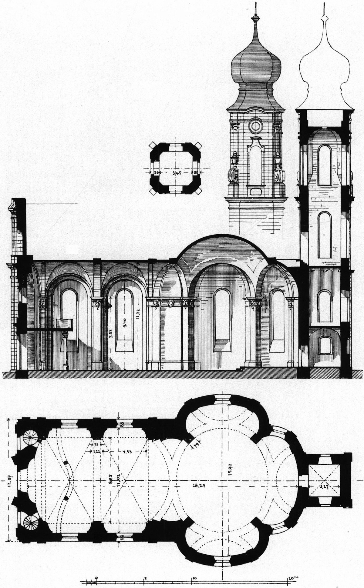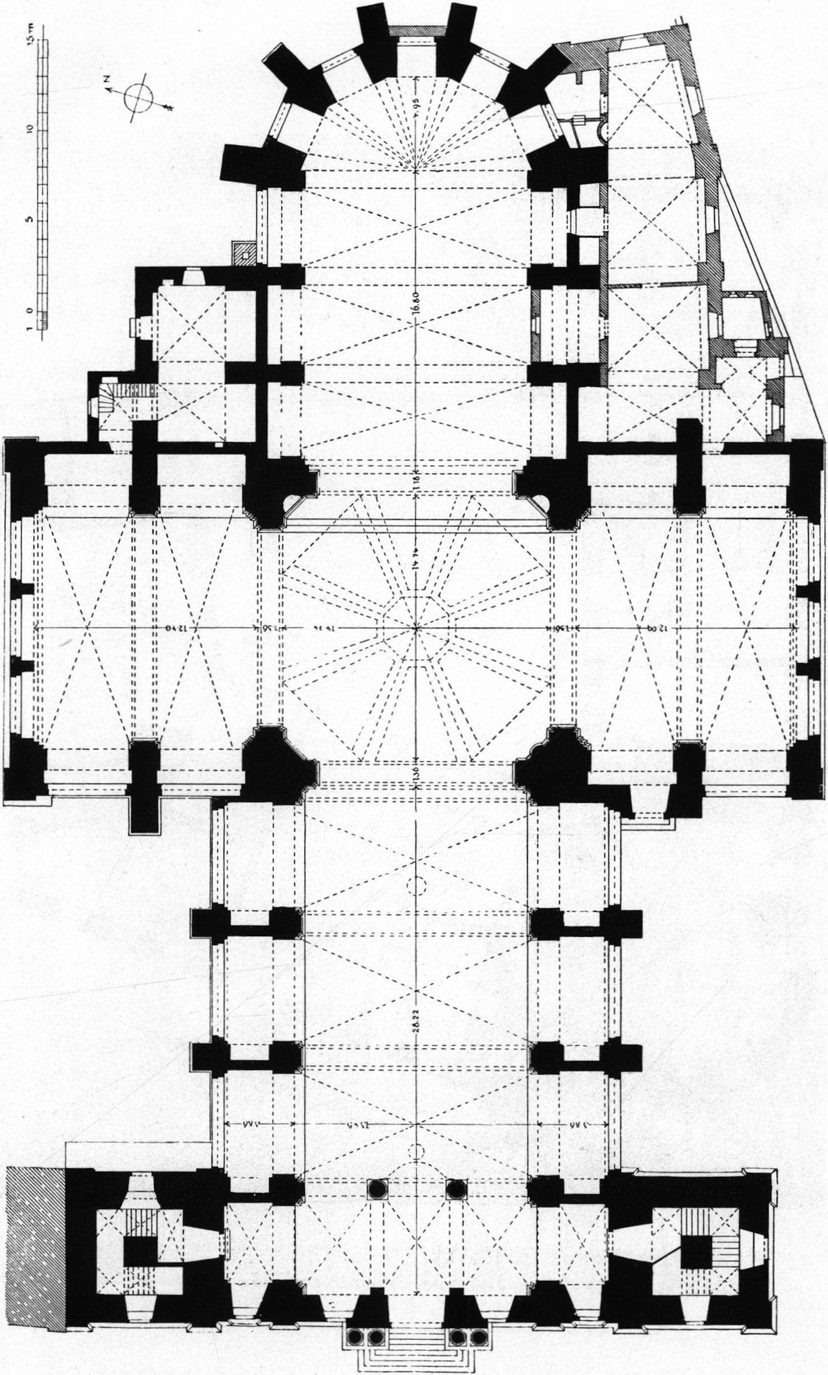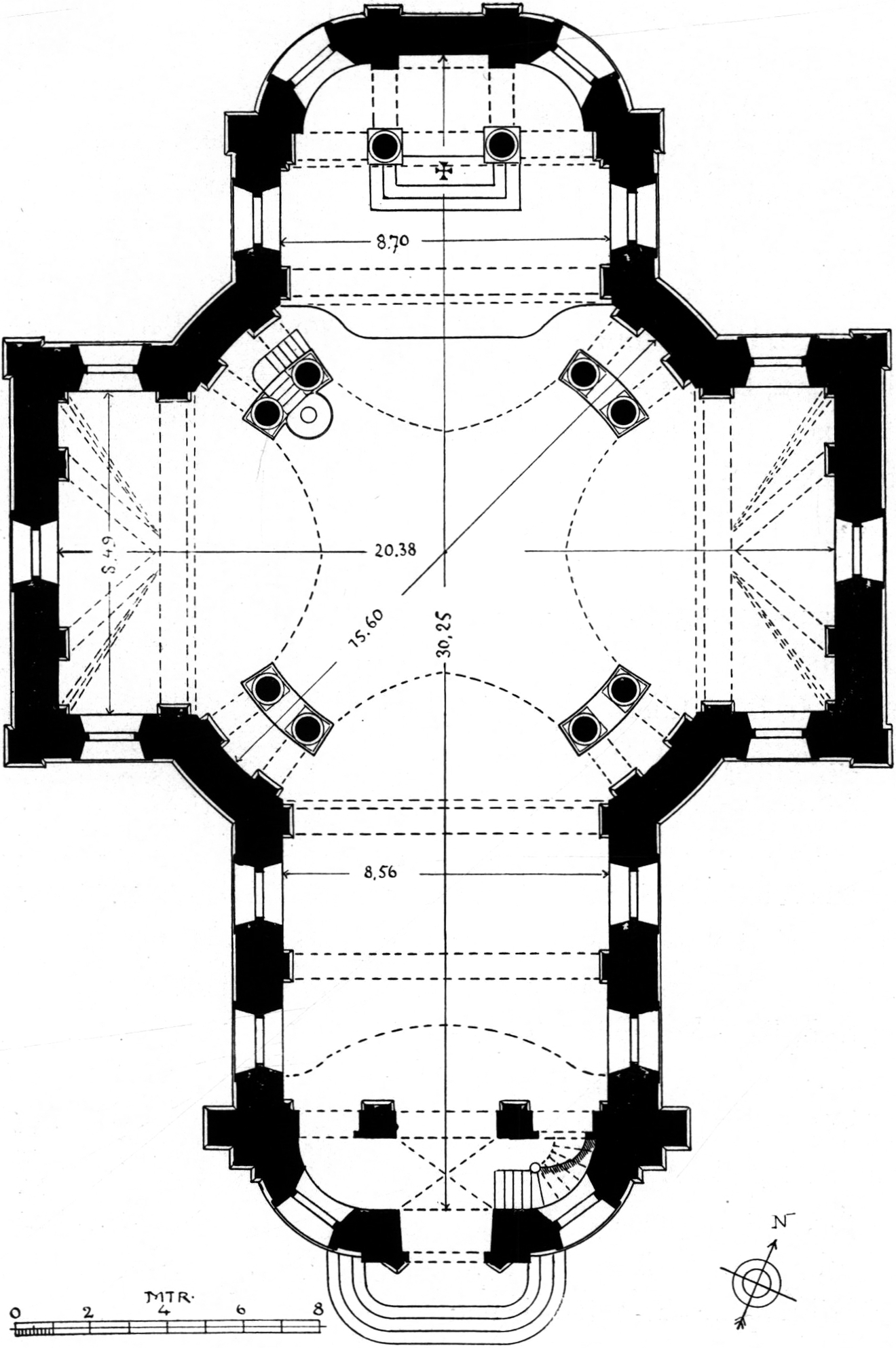 Um die Wende des Jahrhunderts setzt dann in Würzburg die barocke Bewegung mit breiter Front ein. Das Innere des Domes und der Neumünsterkirche wird zeitgemäß erneuert. Die Erbauung einer Domfassade, wozu u. a. Entwürfe von Welsch und Hildebrand vorliegen,[S. vi] blieb trotz mehrmaliger Wiederaufnahme der Angelegenheit nur ein Plan. Dagegen erhielt Neumünster eine prächtige Schauseite, die einen starken Stilfortschritt bedeutete. Die Massen werden hier von einer rhythmischen Kurvenbewegung durchschüttert, die von einem organischen Mittelpunkt auszugehen scheint. Ein neuer Bauausdruck und eine neue Anschauung von künstlerischer Einheit ist hier am Werke. Die besondere Art ihrer Ausprägung weist wohl auf einen maßgebenden Einfluß Johann Dientzenhofers hin, der ja als Vermittler der wichtigen böhmischen Anregungen für den fränkischen Kirchenbau von besonderer Bedeutung ist. Auch Joseph Greising wird bei der Fassadenplanung nicht ganz ausgeschaltet gewesen sein. Er führte ja den Neumünsterumbau und war zu jener Zeit ein angesehener und vielbeschäftigter Mann, der die Vorneumannsche Zeit am würdigsten vertritt. Würzburg war in jener und der unmittelbar darauffolgenden Zeit ein Brennpunkt vieler Strahlen, die aus dem Westen, Osten und Süden hier zusammentrafen. Besonders deutlich tritt dies beim Bau der Schönbornkapelle zu Tage. Sie ist ein Musterbeispiel damaliger Planungs- und Ausführungsarbeit, Ergebnis mannigfaltigen Zusammenwirkens von künstlerisch oft gegensätzlichen Persönlichkeiten. Immer neue Entwürfe treiben Baugedanken und -gestalt vorwärts, bis das Ganze schließlich in solchem Maße einheitlich vollendet dasteht, daß es nur aus dem genialen Haupte eines Einzelnen entsprungen zu sein scheint. Hierin tritt Innerstes vom künstlerischen Wesen dieses Jahrhunderts zu Tage. Bei der Schönbornkapelle stammten die zunächst entscheidenden Risse von dem Mainzer Baudirektor Maximilian von Welsch; die örtliche Bauleitung hatte Balthasar Neumann, was nicht zu gering geachtet werden darf; auf seine Rechnung muß man wohl die Einführung der freistehenden Säulenpaare schreiben. Dekorative Einzelheiten steuerte der Wiener Johann Lukas v. Hildebrand bei; Entwürfe kamen auch aus Paris, von G. Boffrand, und wiederum tritt uns, wohl nicht aktenmäßig belegbar, aber doch deutlich zu spüren, die Kunst Johann Dientzenhofers[S. vii] entgegen, der damals in enger Zusammenarbeit mit Neumann beim Residenzbau tätig war. Ihm danken wir wohl die Weiterbildung des Grundrisses, von den nebeneinander lagernden Raumteilen des Welsch’schen Planes, zu deren einheitsbewußtem gegenseitigen Durchdringen, wie wir das am ausgeführten Bau sehen. Dabei treten auch die gekrümmten Gurten auf, die wir aus Banz und Böhmen kennen und die letzten Endes auf Quarini zurückgehen. Aus all dieser Bemühung wuchs schließlich der strahlend schöne Bau mit dem Adel seiner Verhältnisse, den kostbar geschnittenen Einzelheiten, der Klarheit und Kraft seines Körpers. Hiermit ward im Barockzeitalter der Würzburger Stil, wenn man das Wort gebrauchen will, der das künstlerische Wesen dieser Stadt am reinsten auszudrücken scheint, zum ersten Male in vollendeter Form gestaltet.