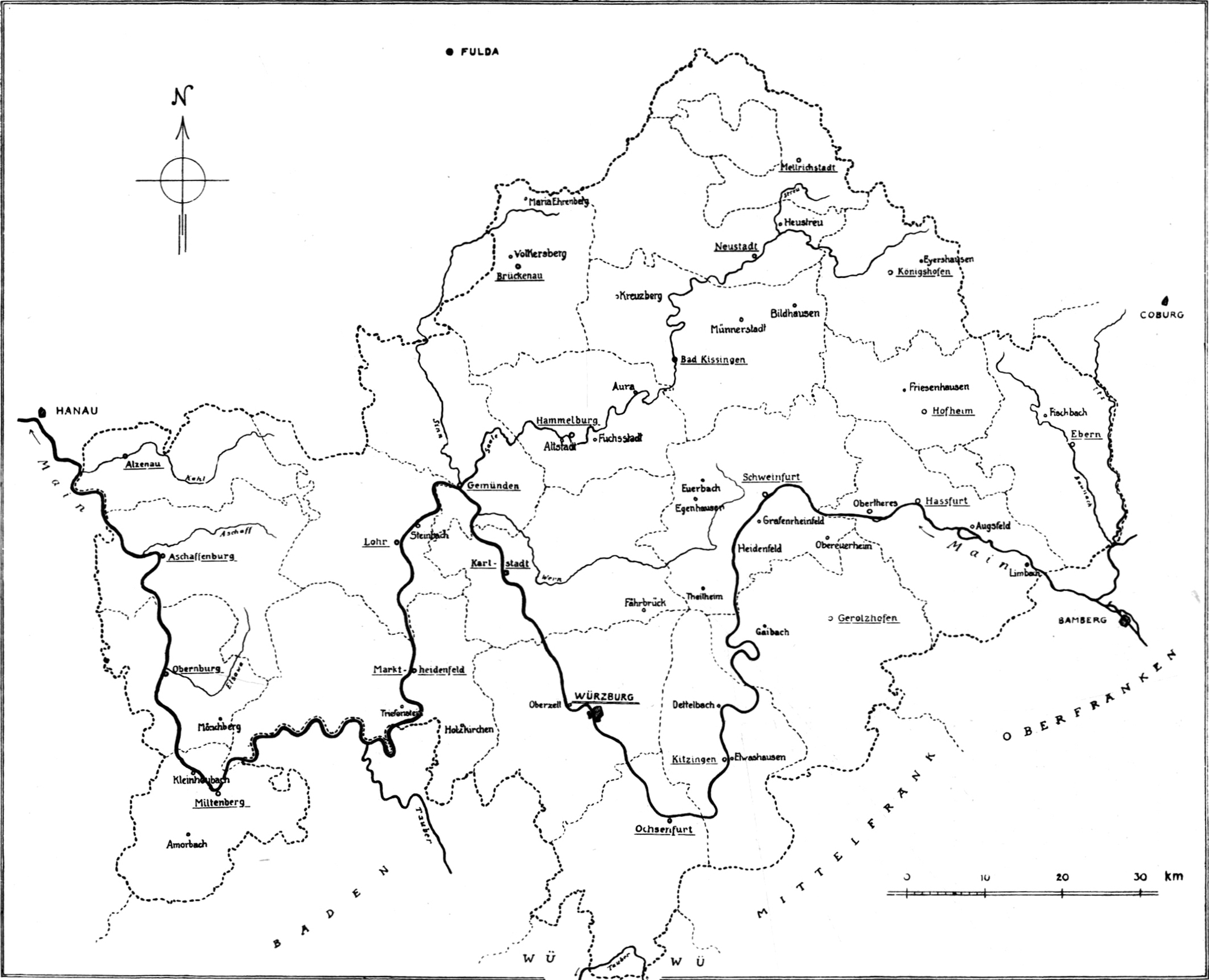 Barocke Baukunst strebt nach Raumordnung in großzügigem Ausmaß. Abgesehen von bedeutenden Residenzen und Gärten sind es die Klöster, die solchem Machtwillen besonders entgegenkommen. Hier ließ sich eine vielfältige Welt mit großer Gesinnung einheitlich gestalten, wie wir das sehr gut an dem bekannten, nicht völlig ausgeführten[S. x] Plane von Weingarten (Württemberg) aus dem Jahre 1723 und auch an vielen tatsächlich gebauten und noch vorhandenen Beispielen, besonders in Österreich erleben können. Solche ganz mächtige Anlagen entstanden damals in Unterfranken nicht. Doch wurde viel geplant und im einzelnen auch viel erneuert. Und so kostbare Bauten verdanken wir jener Zeit, wie die schlicht vornehme Propstei von Heidenfeld und den festlichen Abteiflügel von Oberzell.