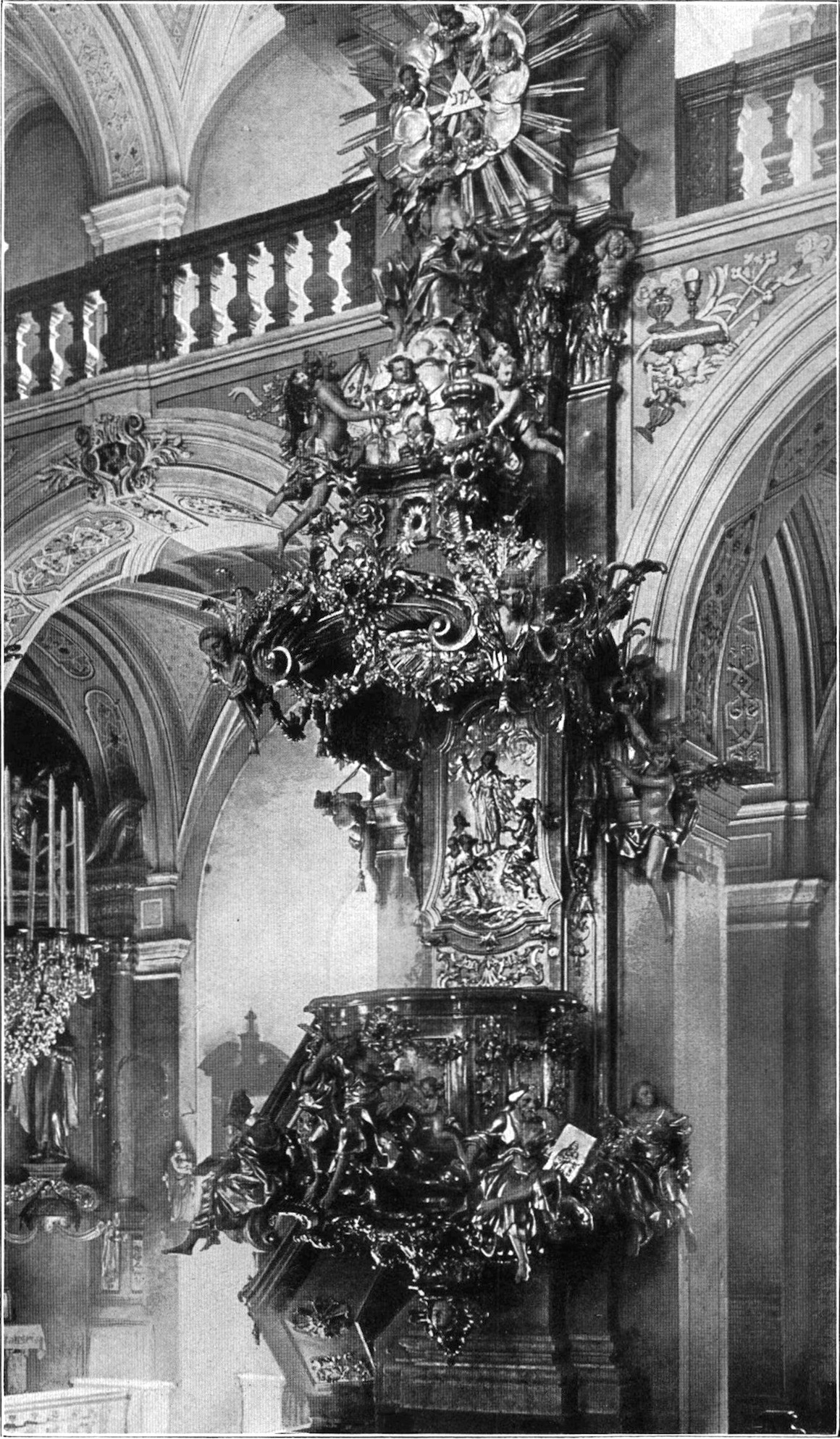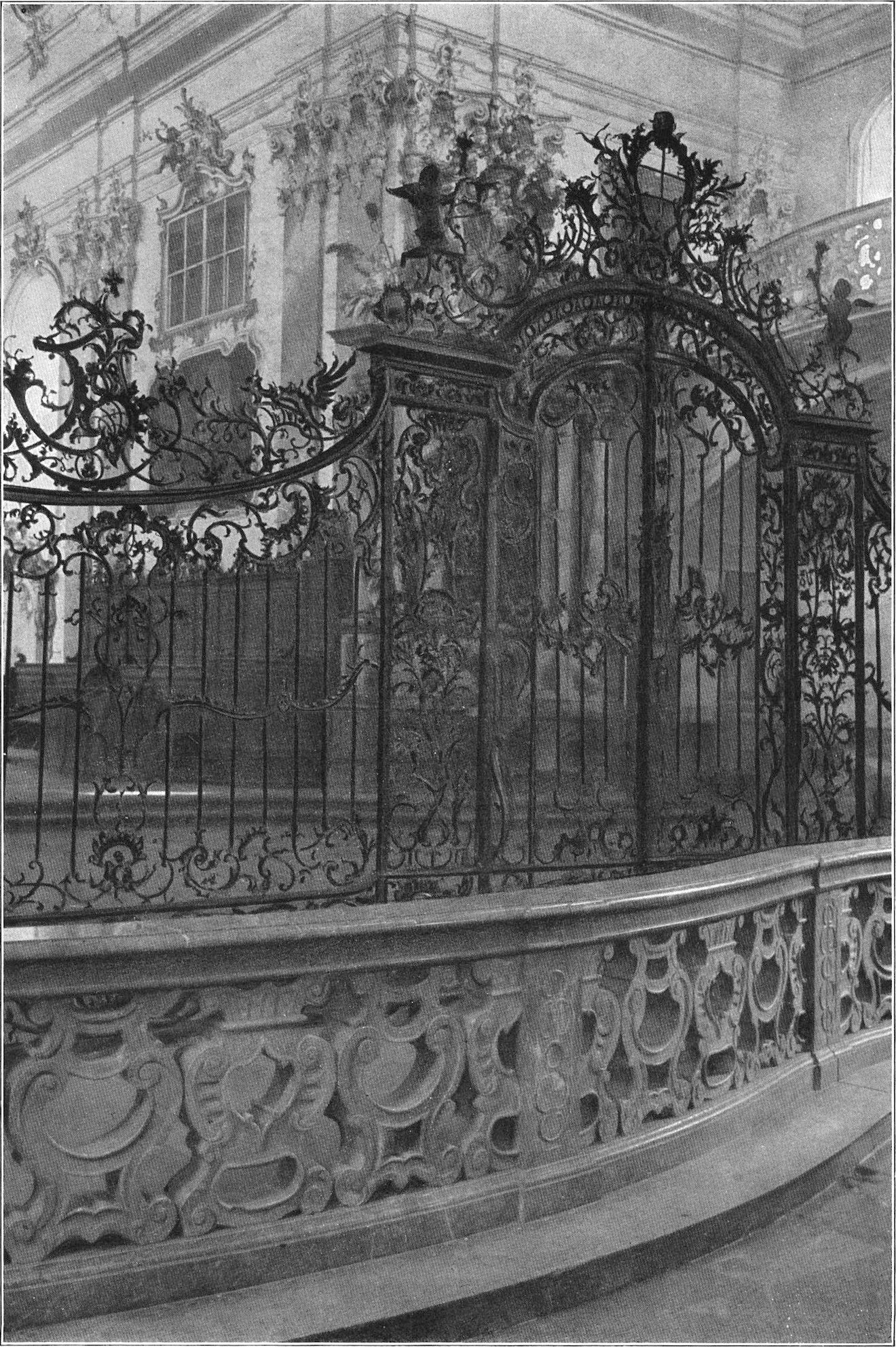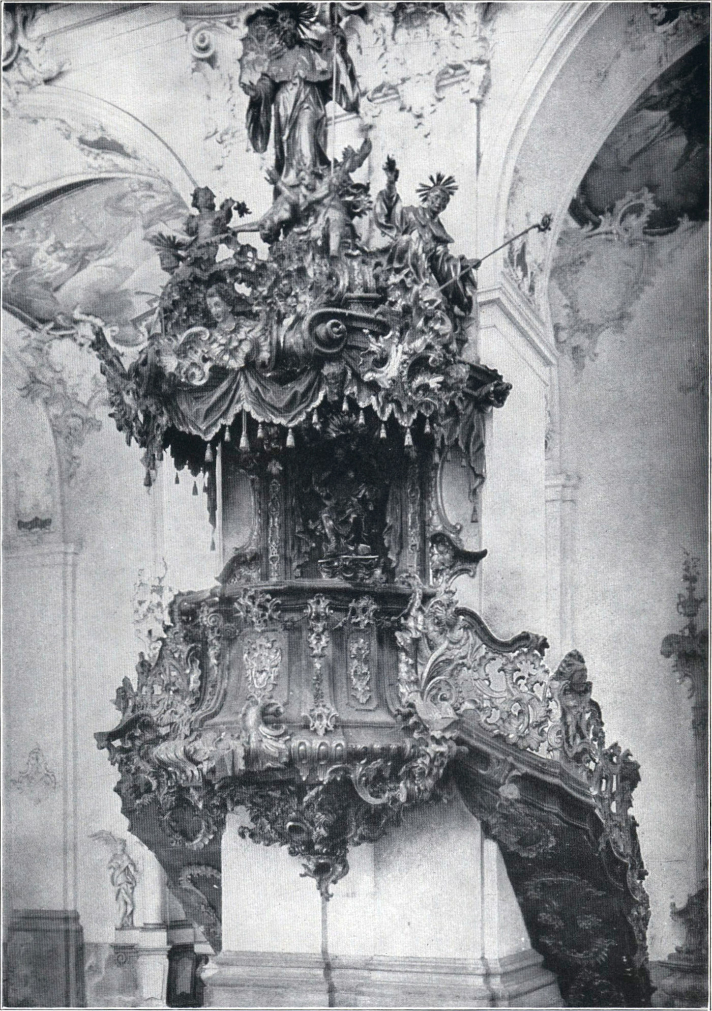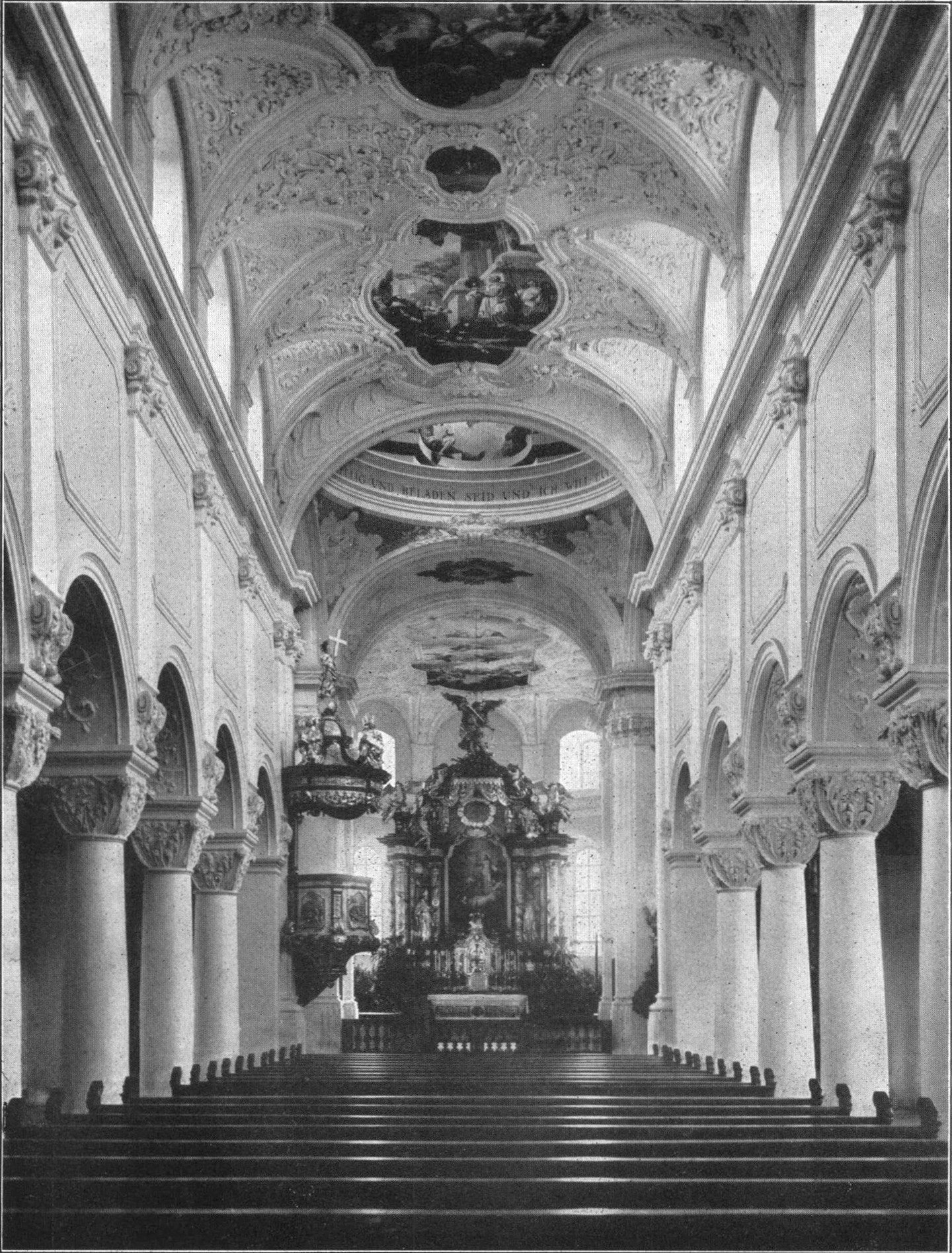 Als Ganzes ist die Hofkirche wiederum eine Glanzleistung der Gemeinschaftsarbeit, besonders auch was ihre hervorragende Ausstattung anbelangt, bei der Hildebrand, Antonio Bossi und Rudolf Byß hauptbeteiligt sind. Alle Einzeldinge sind aus dem Sinne des Raumes gestaltet, aus dem Willen zum äußersten Einheitskunstwerk und seinem Ausdruck, der alles erfüllenden hinreißenden Festlichkeit. Jeder Gegenstand und jeder Zierat biegt und formt sich unter der wehenden Bewegung, die innerhalb eines starren gegebenen Rechteckes durch die kunstvoll hineingestellte Raumschale hervorgezaubert wird. Staunenswert ist die gemeinsame Stilgesinnung, die alles trägt, bewundernswert aber auch die persönliche Leistung aller einzelnen Meister, deren sich Würzburg damals rühmen konnte. Proben ihres Könnens zeigt noch manches Würzburger Gotteshaus, wie das der Augustiner mit seinen[S. ix] glänzenden Altären oder St. Peter, dessen formsprühende und doch gebändigte Kanzel unvergleichlichen Reiz verstreut.